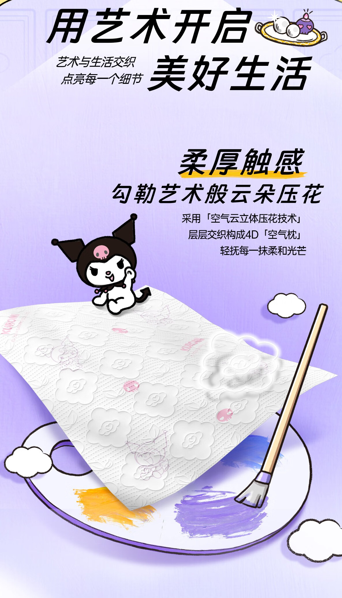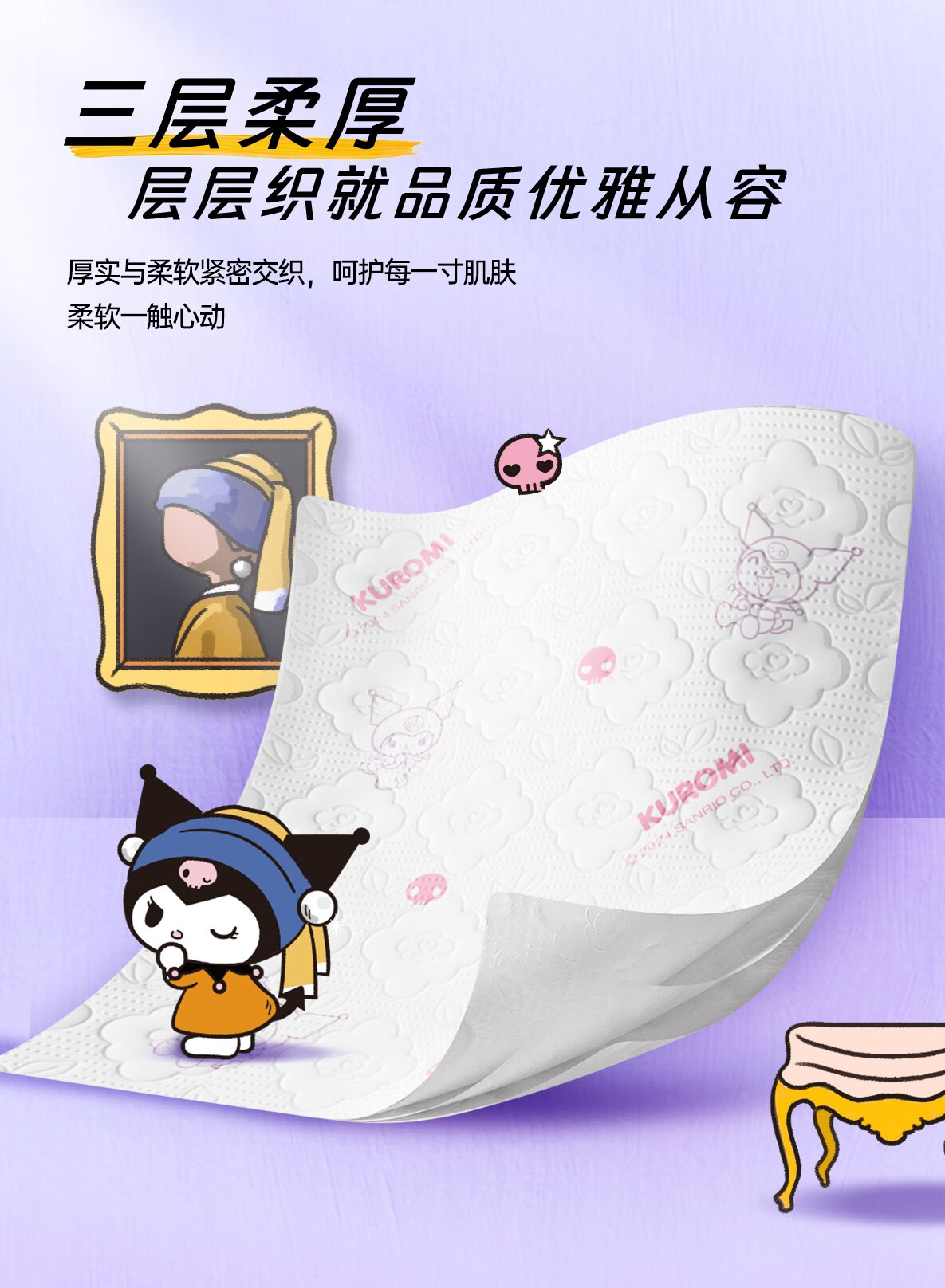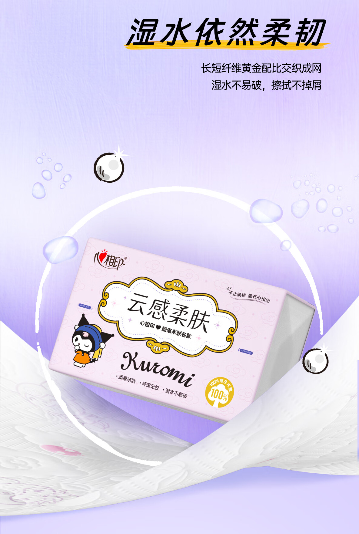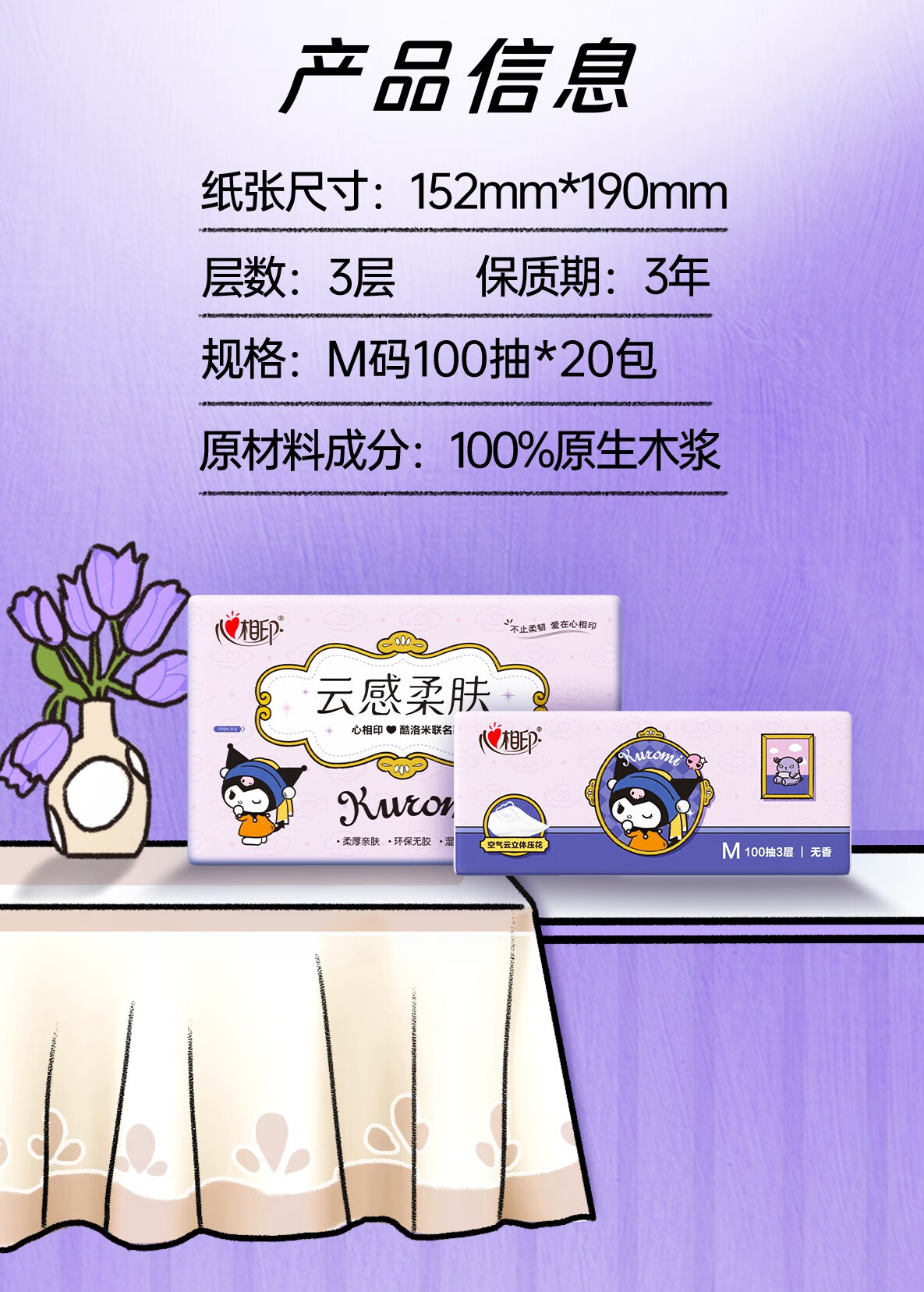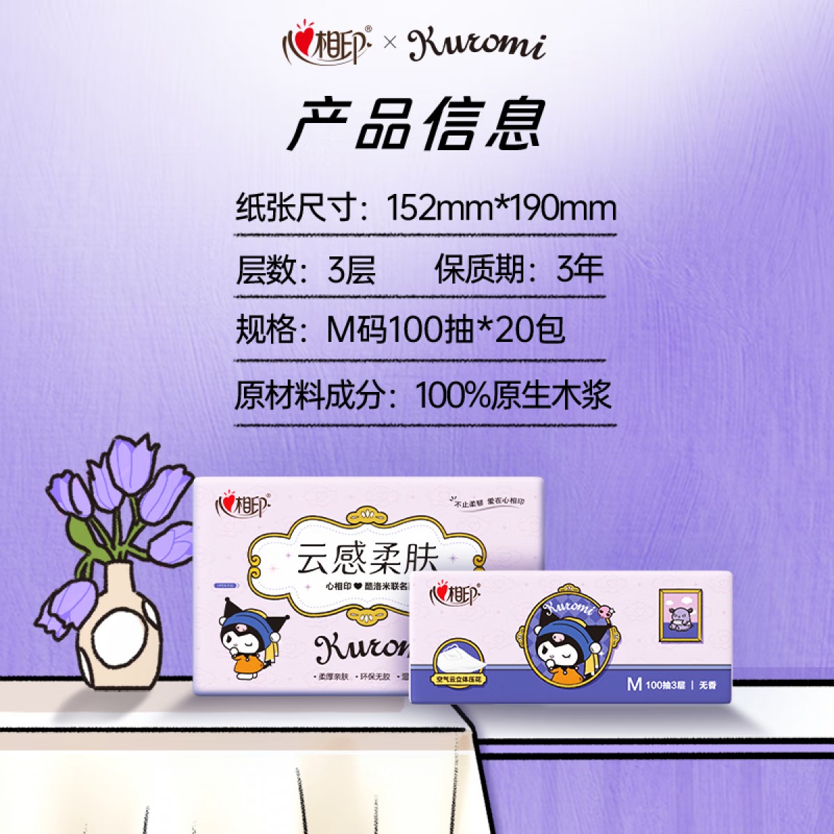商品名称:心相印 云感100抽20包三层立体压花塑装面巾纸三丽鸥联名款(M码) DT18100(箱装)