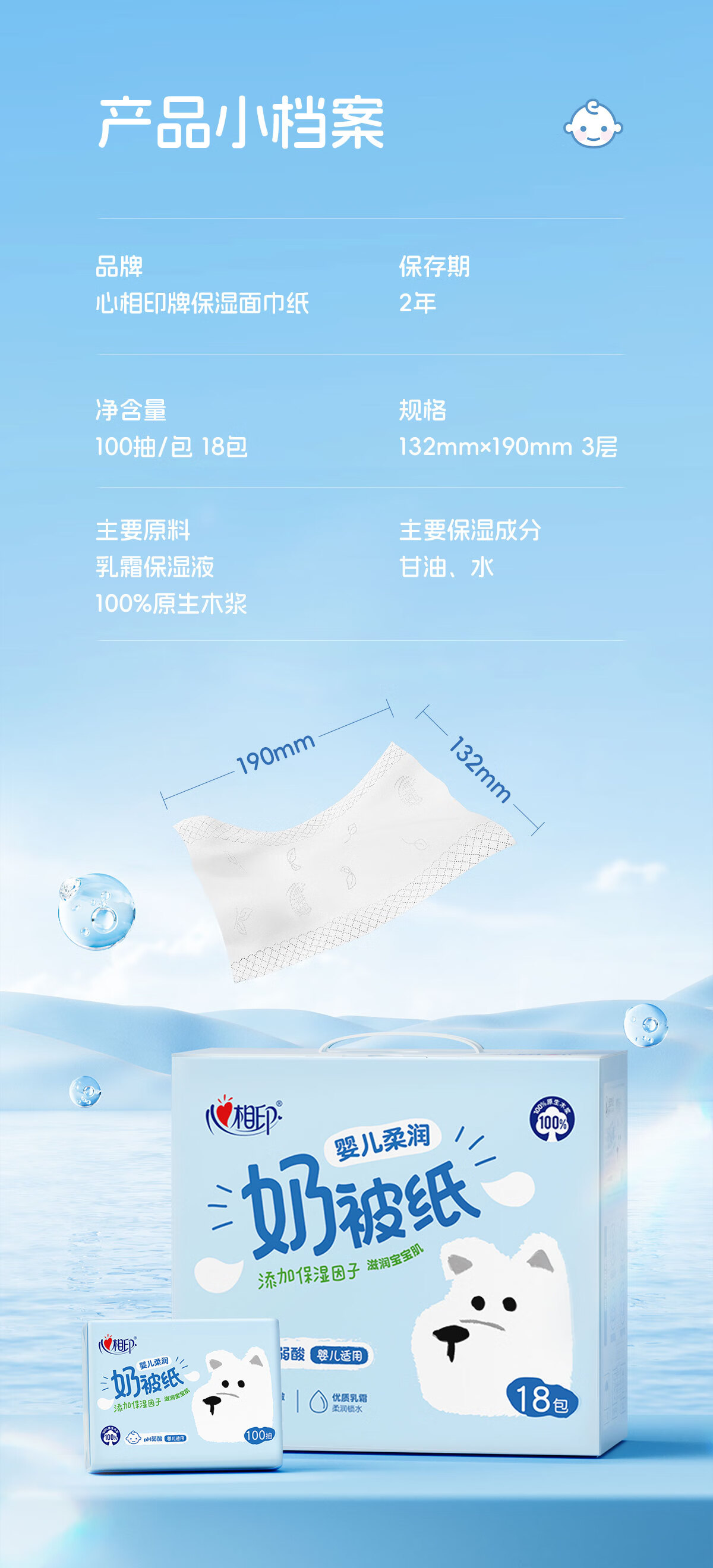 商品名称:心相印 婴儿柔润奶被乳霜纸18包100抽三层塑装面巾纸 18DT31100(包装)