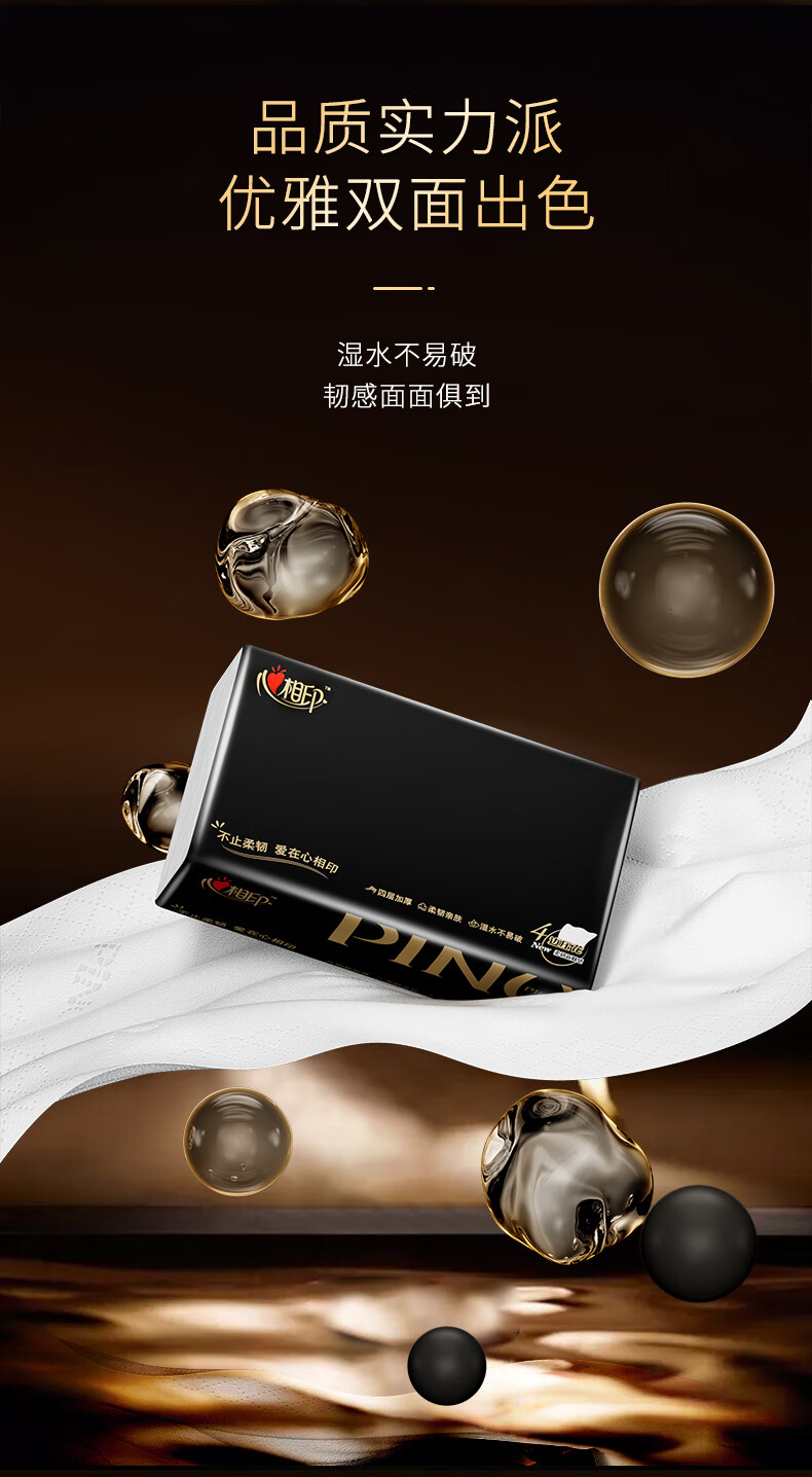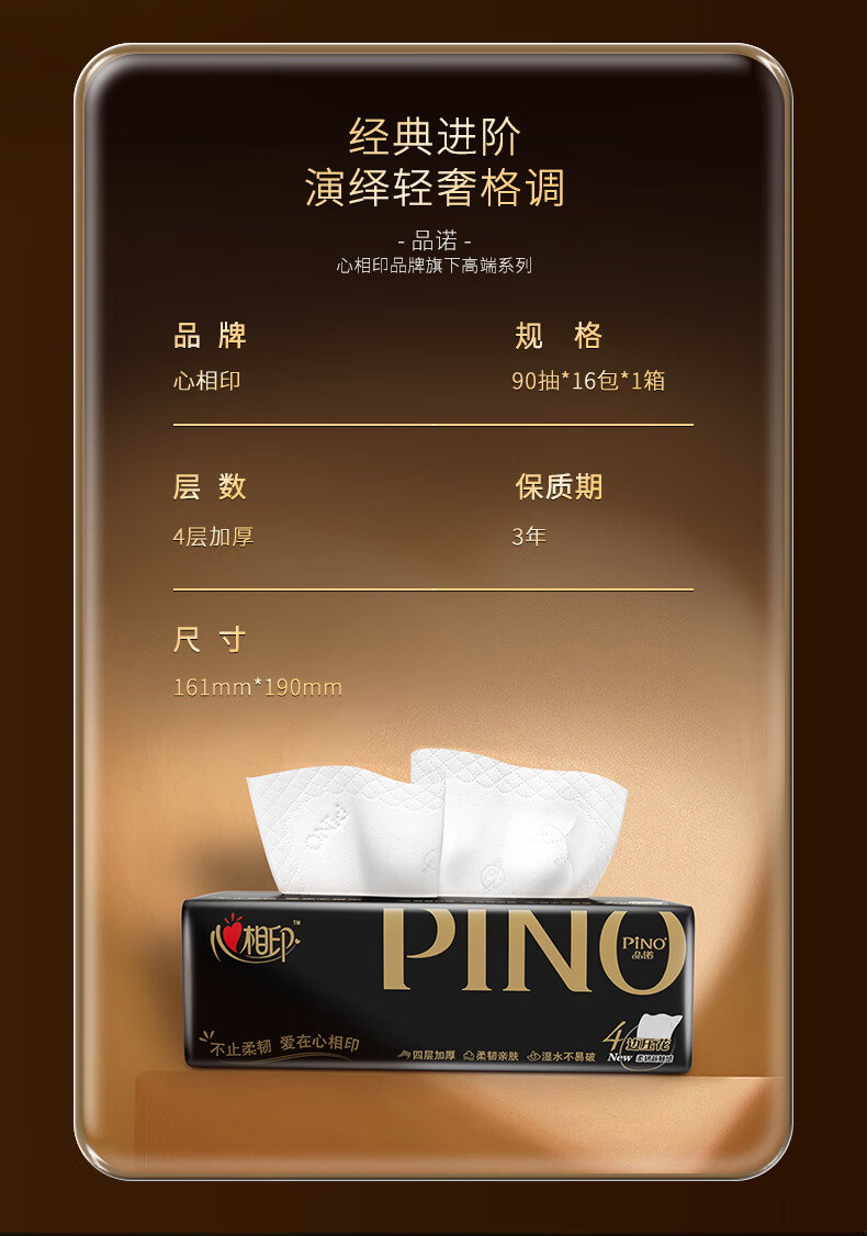 商品名称:心相印 品诺系列黑色经典90抽16包装四层塑装纸面巾(加大M码) PDT3090(箱装)