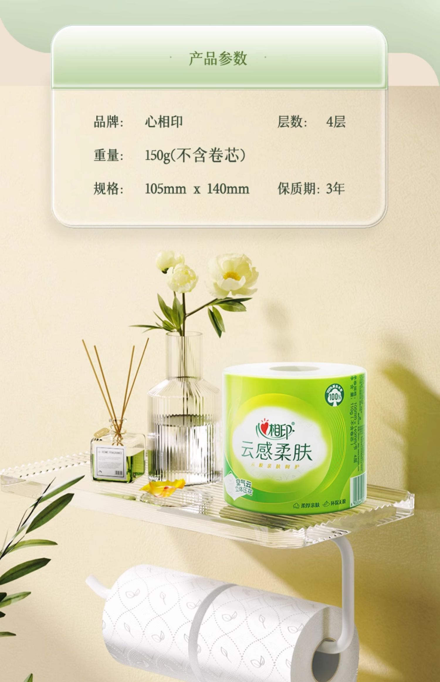 商品名称:心相印 云感系列150克10粒装四层立体压花卷筒卫生纸 BT5410(提装)