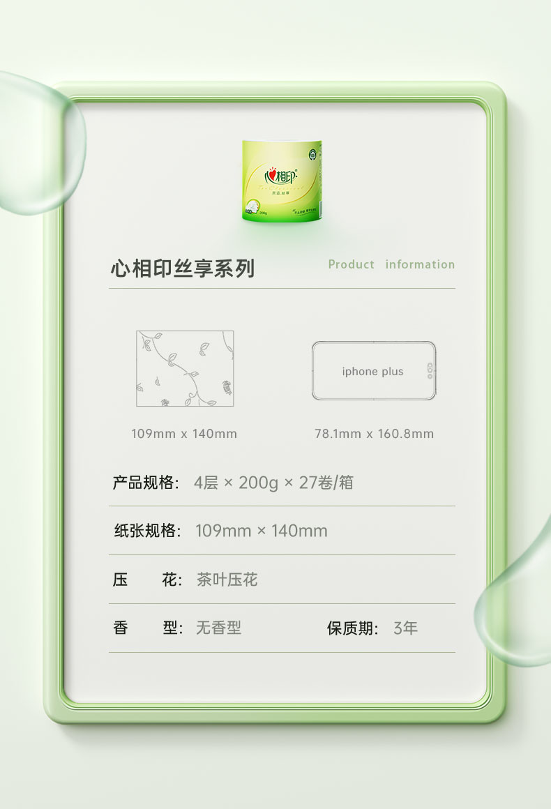 商品名称:心相印 茶语经典200克27粒装四层茶叶压花卷筒卫生纸 BT2610(箱装)