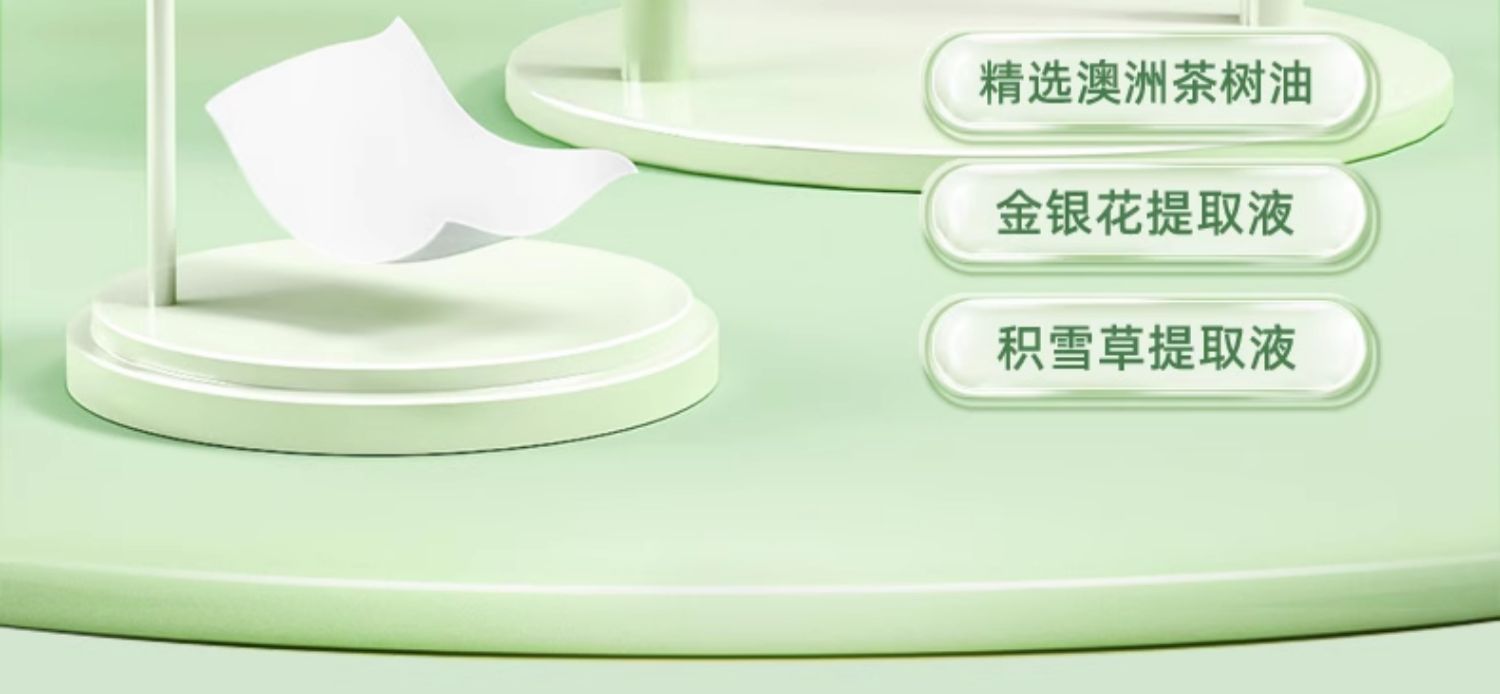 原料成分 :纯水、水刺无纺布、澳洲茶树油、 金银花提取液、积雪草提取液