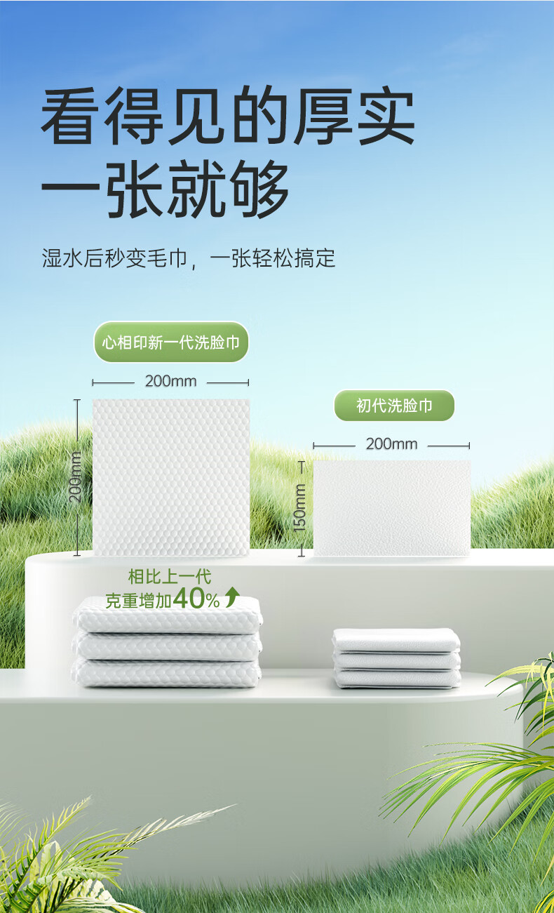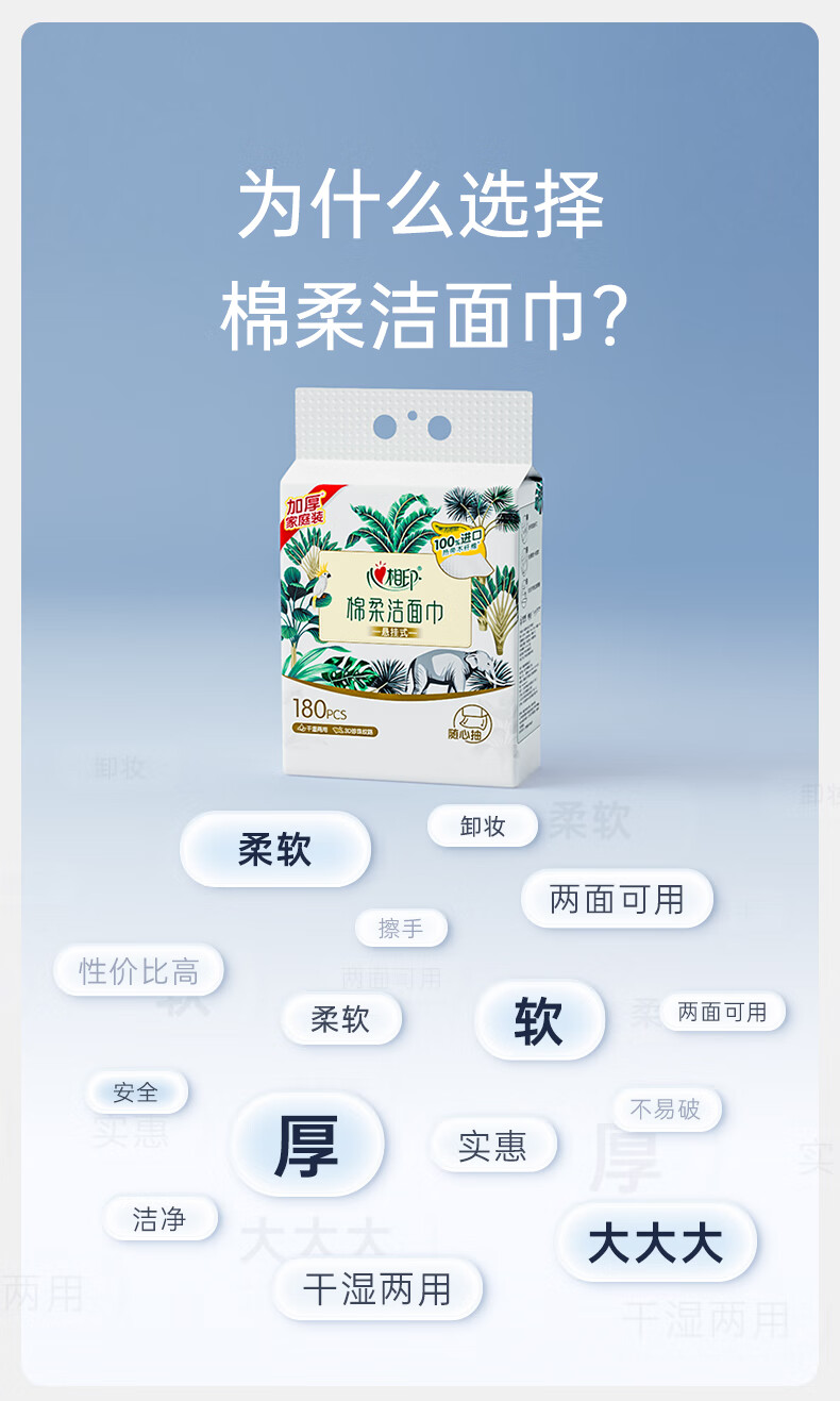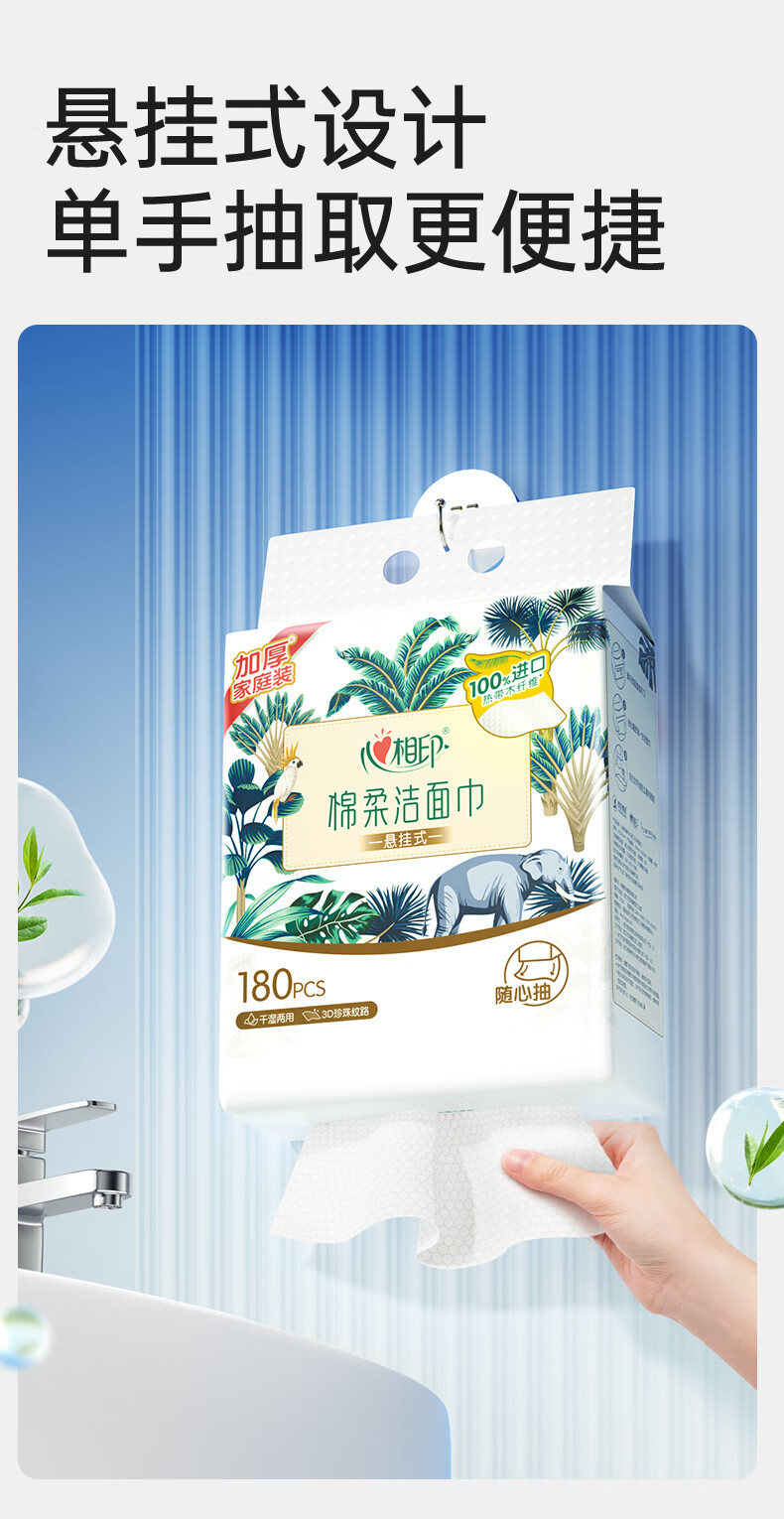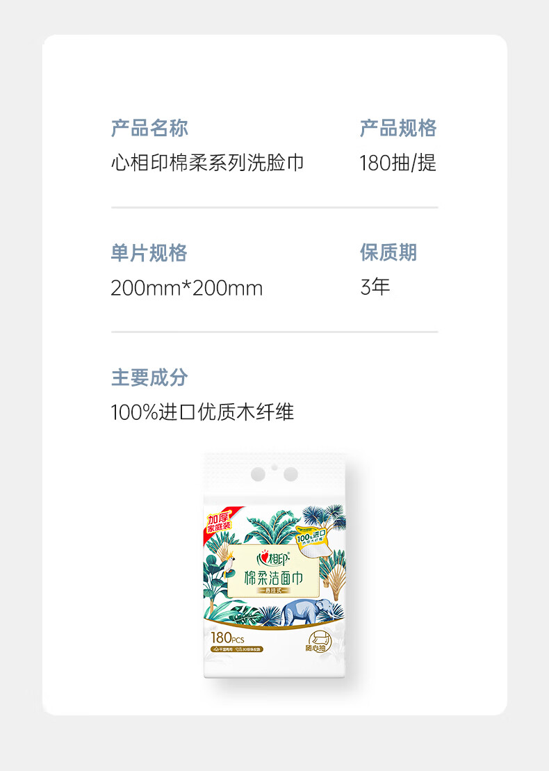 商品名称:心相印 棉柔系列180片装悬挂式洗脸巾(随心抽)*2提 XCD180+P1