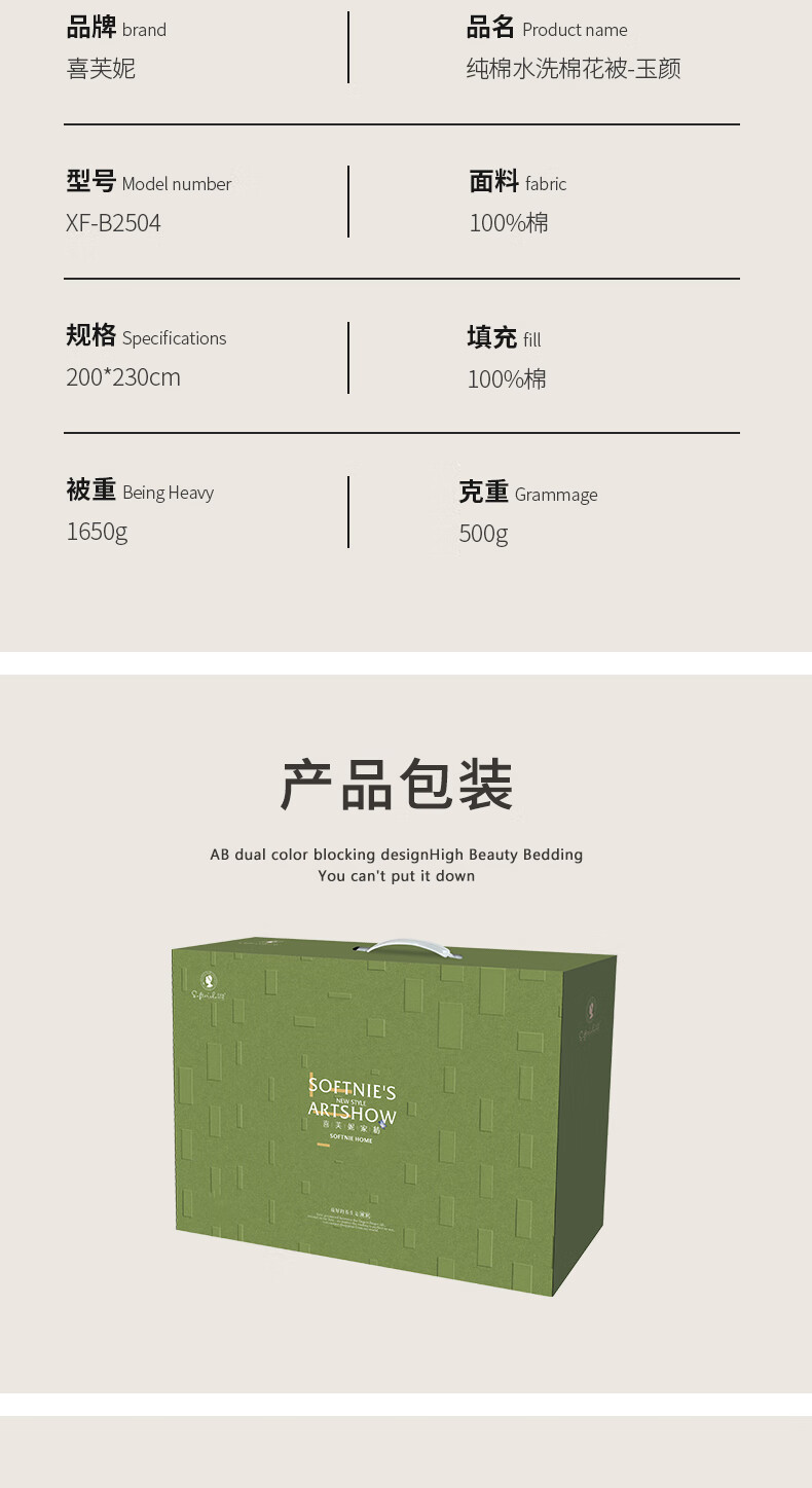 商品名称:喜芙妮 纯棉水洗棉花被-玉颜 200*230cm 1650g XF-B2504