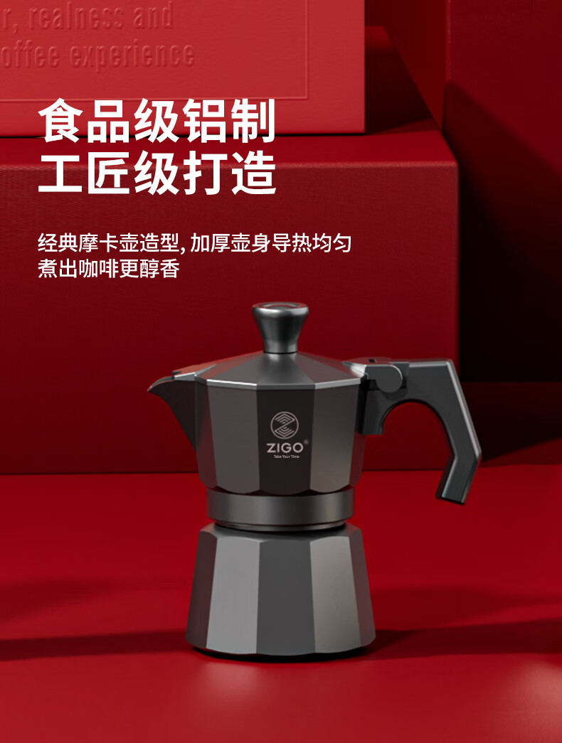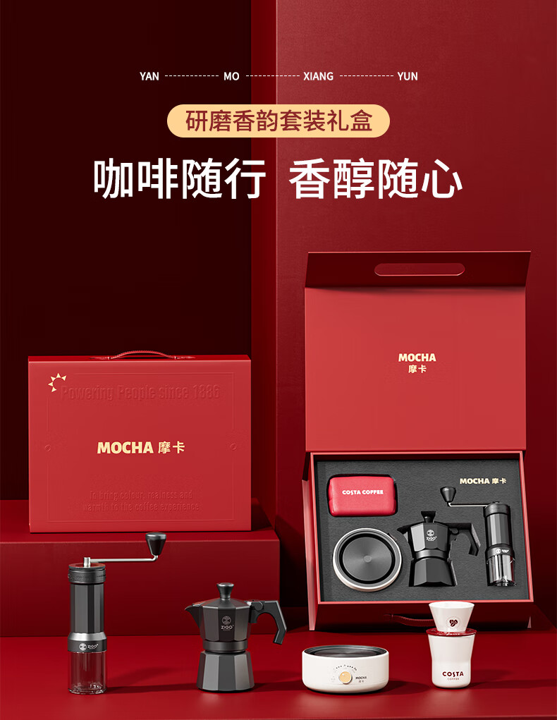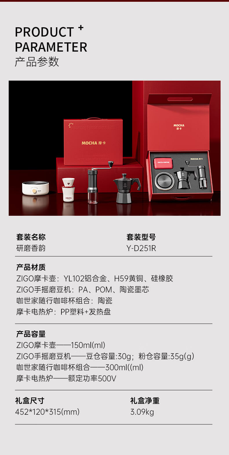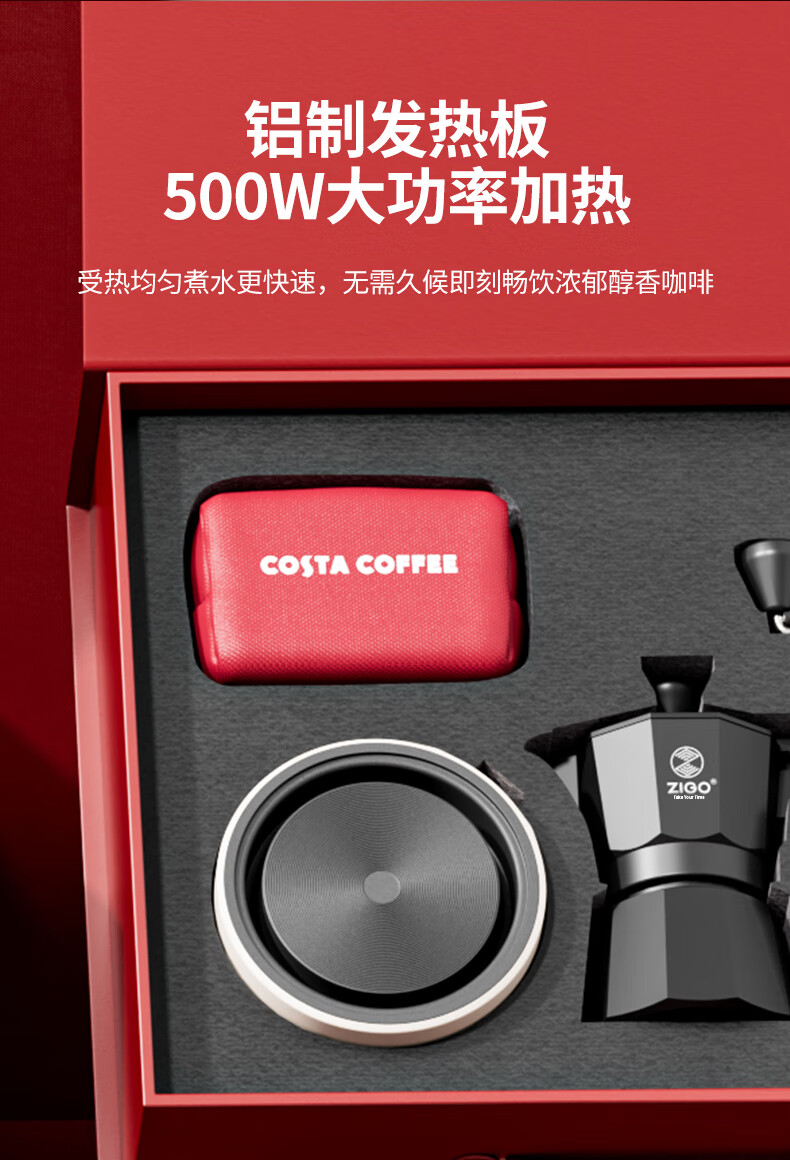 包装清单 :·ZIGO摩卡壶*1、ZIGO手摇磨豆机*1、Costa咖啡杯组合*1、摩卡电热炉*1