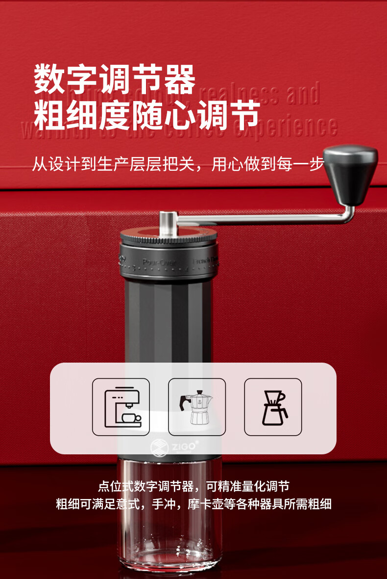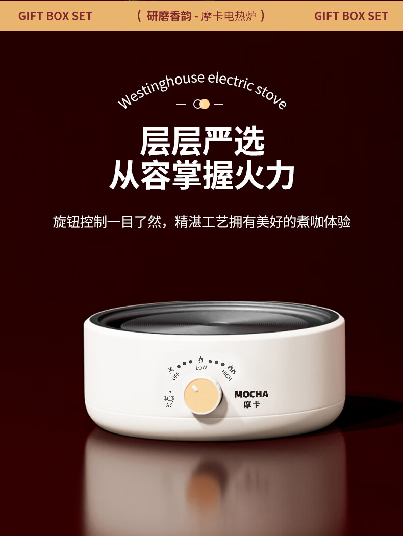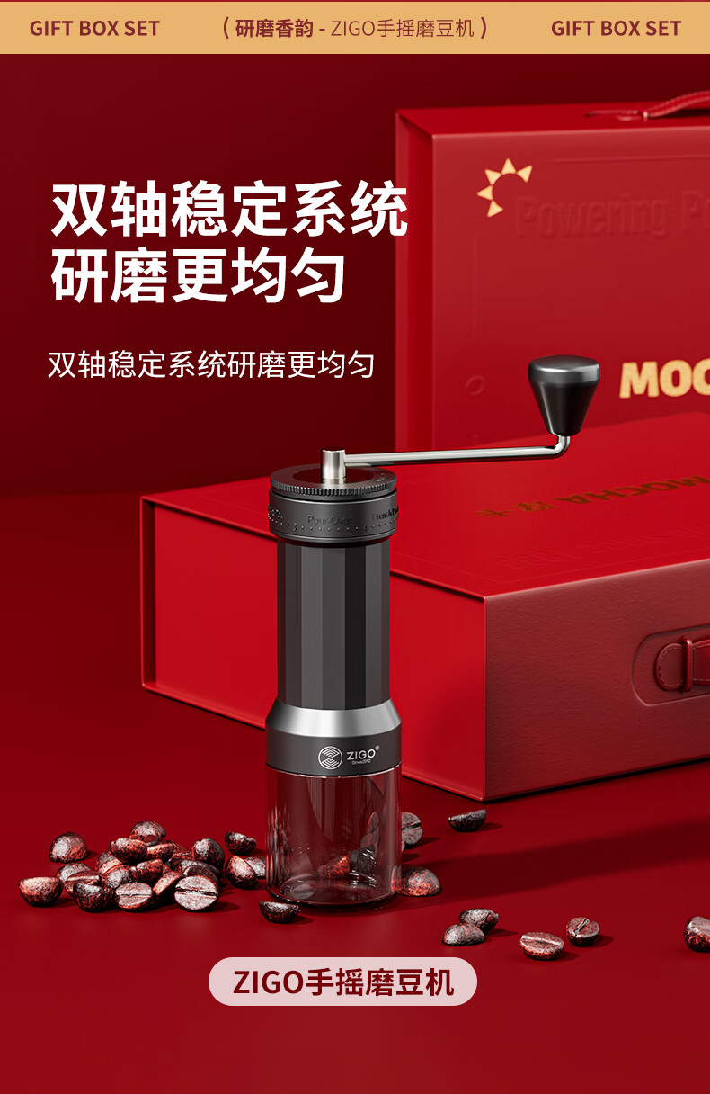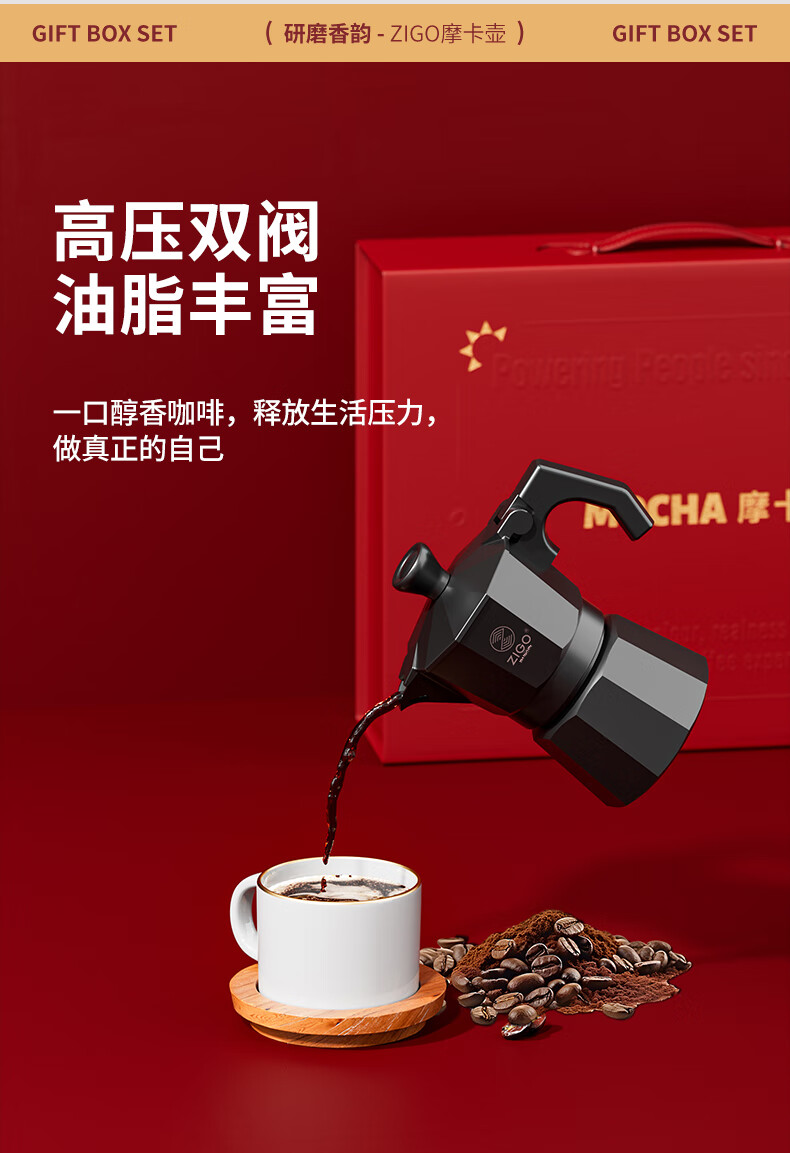 包装清单 :·ZIGO摩卡壶*1、ZIGO手摇磨豆机*1、Costa咖啡杯组合*1、摩卡电热炉*1