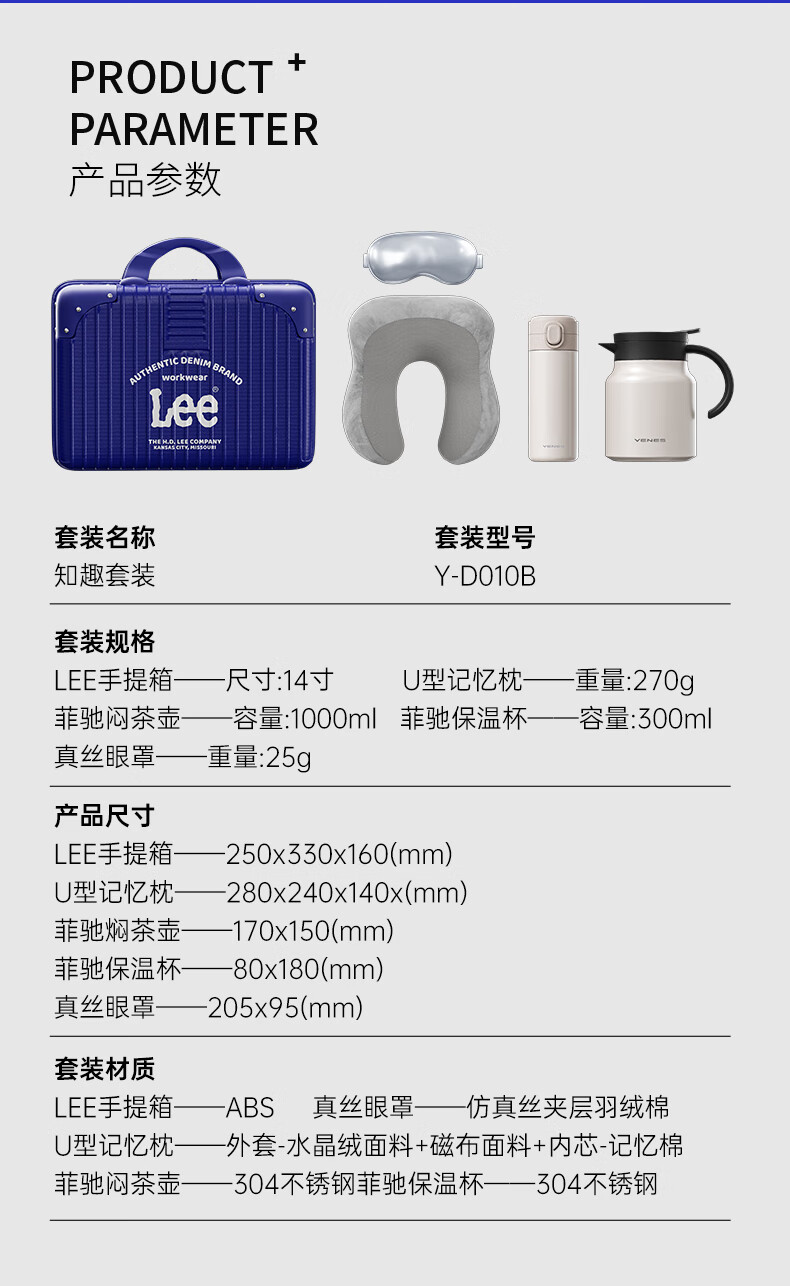 包装清单 :LEE手提箱*1、真丝眼罩*1,富安娜法兰绒毯*1