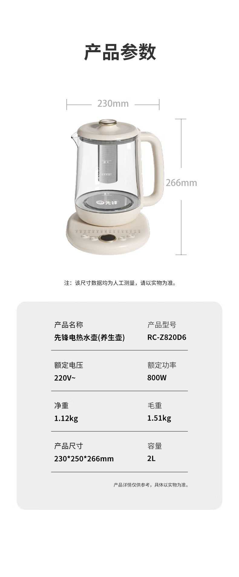 商品名称:先锋 电热水壶(养生壶) 2.0L RC-Z820D6
