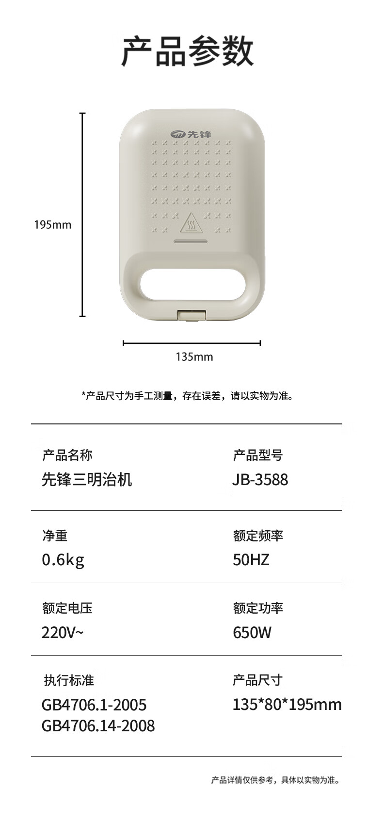 商品名称:先锋 三明治炉(早餐机) 650W JB-3588
