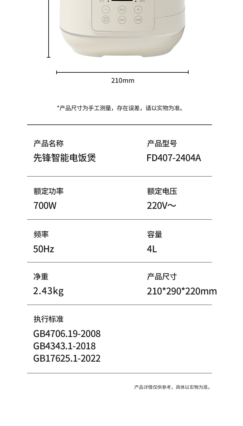 商品名称:先锋 智能电饭煲 4L FD407-2404A