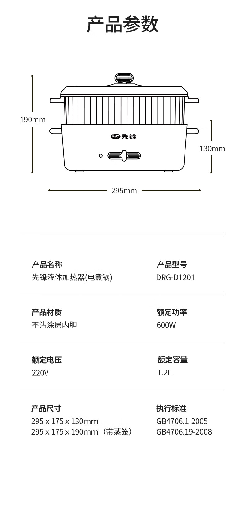 商品名称:先锋 液体加热器(电煮锅) 1.2L DRG-D1201