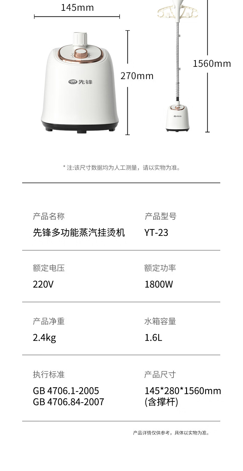 商品名称:先锋 多功能蒸汽挂烫机 多功能蒸汽挂烫机 1.6L YT-23