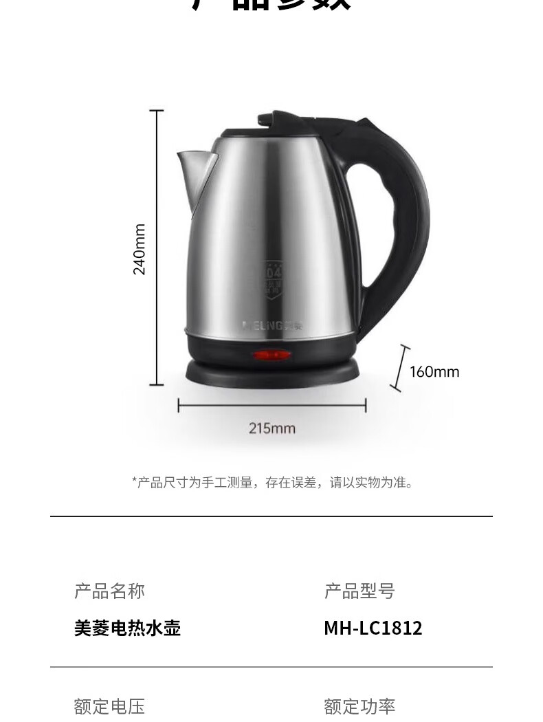 商品名称:美菱 电热水壶 1.8L MH-LC1812
