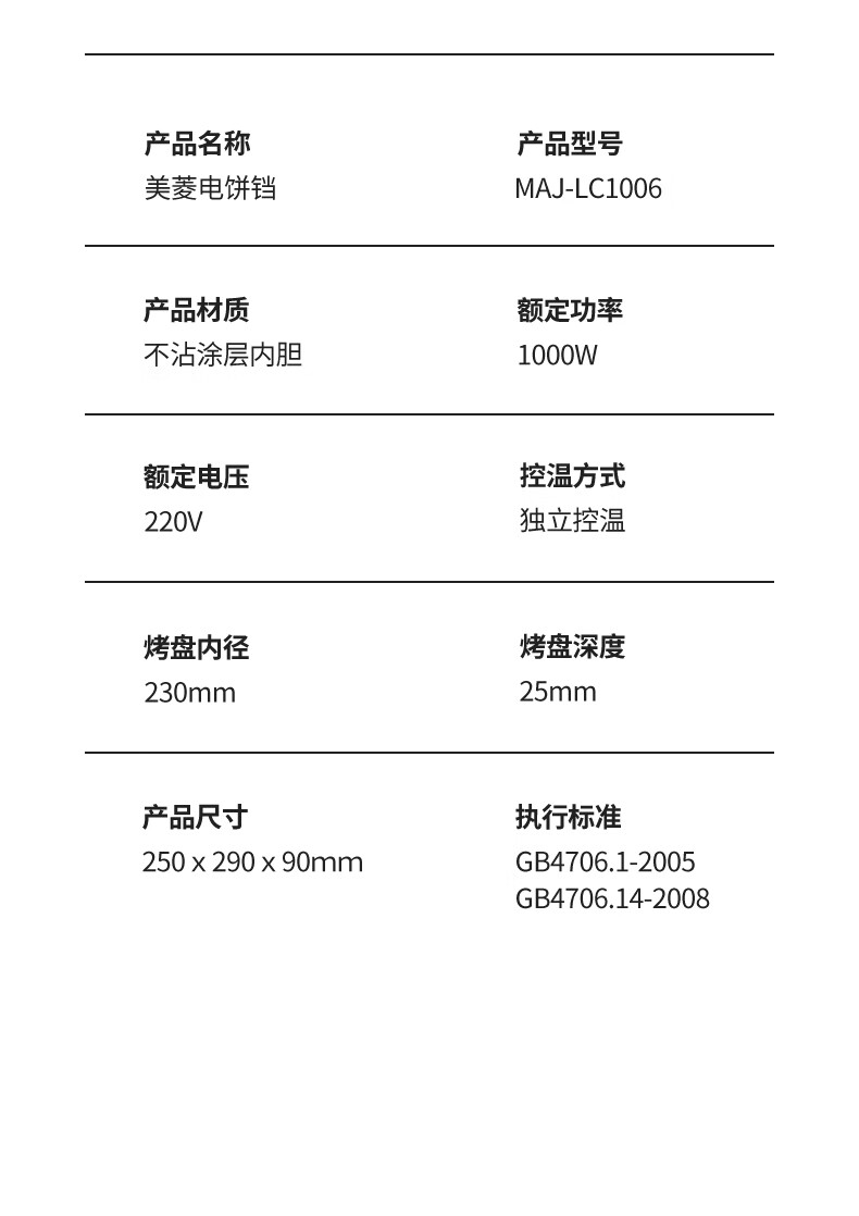 商品名称:美菱 电饼铛 1000W MAJ-LC1006