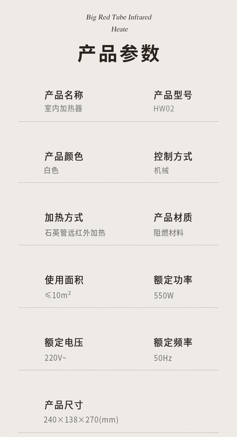 商品名称:米贝丽 大红管取暖器 550W HW02-12