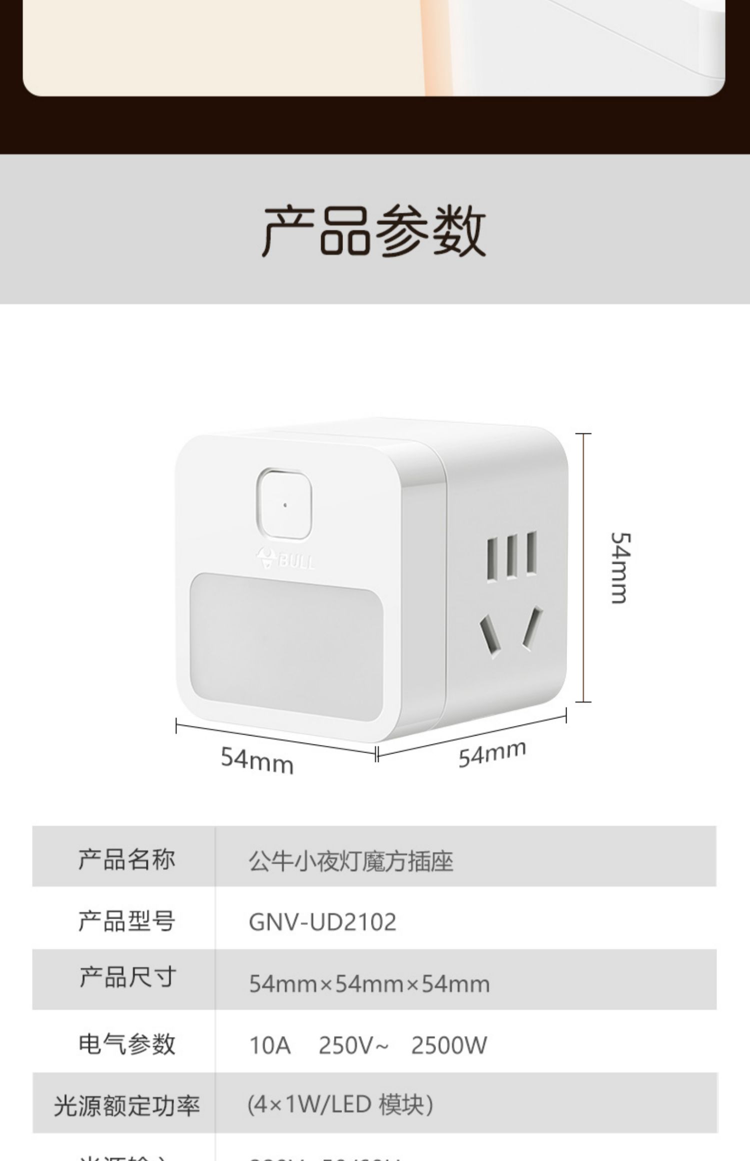 商品名称:公牛 无线夜灯小魔方插座 UD2102