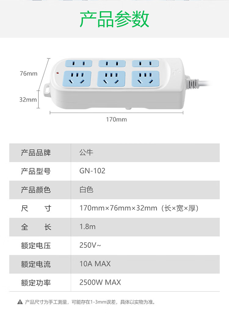 商品名称:公牛 新国标插座 1.8m GN-102
