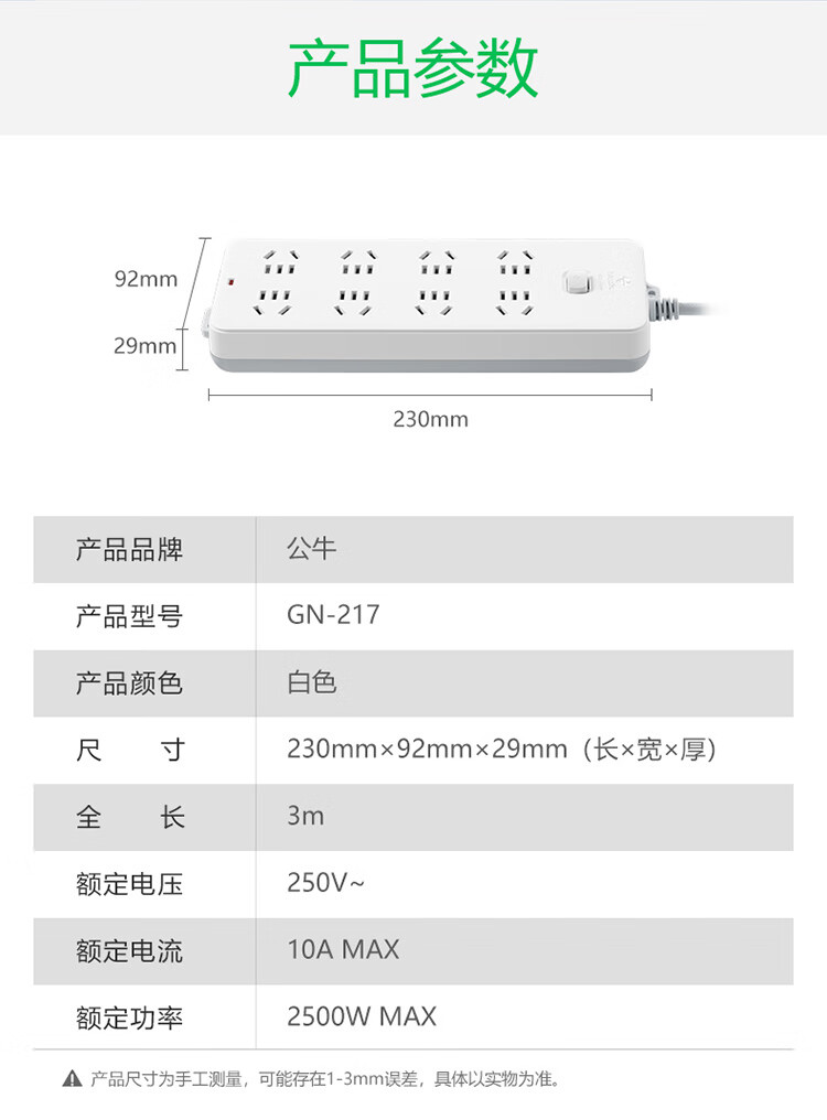 商品名称:公牛 新国标过载保护插座 3米 GN-217