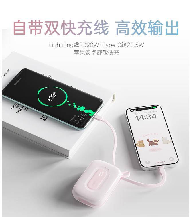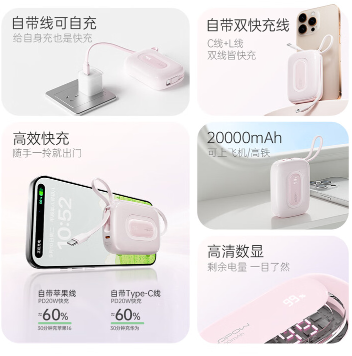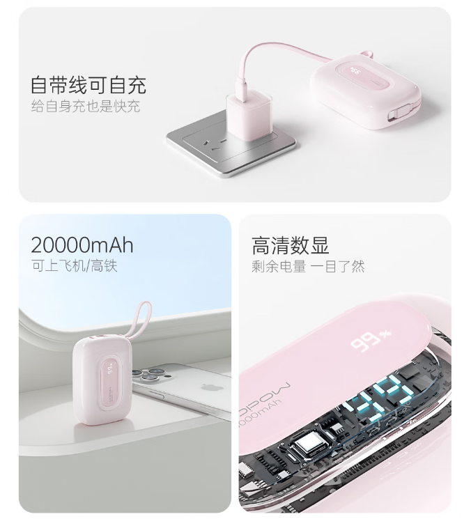 沃品(WOPOW)【3c认证】小彩蛋充电宝 大容量22.5w快充自带线可上飞机20000mAh SQ73 (电商款)