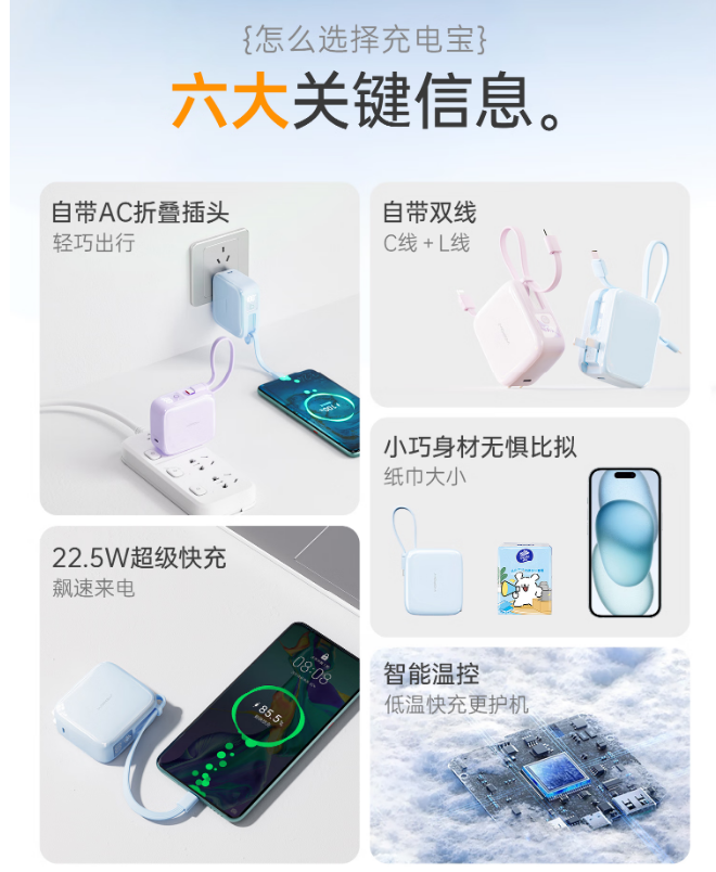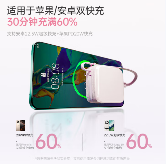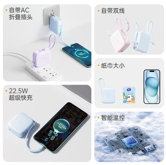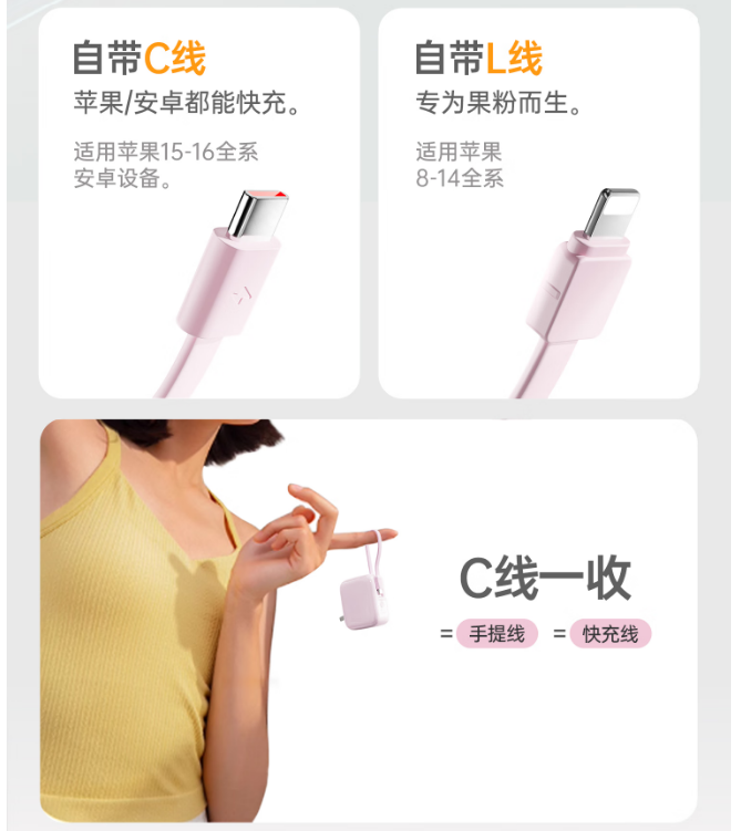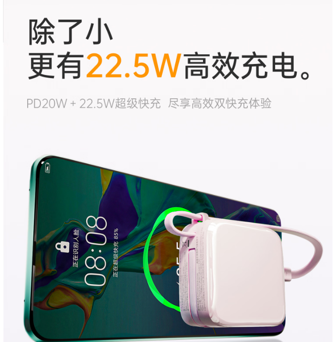 双线设计,超强兼容,苹果/安卓不受限,还是便携挂绳线,22.5W超级快充+PD20W快充,智能芯片+温控传感,实现低温快