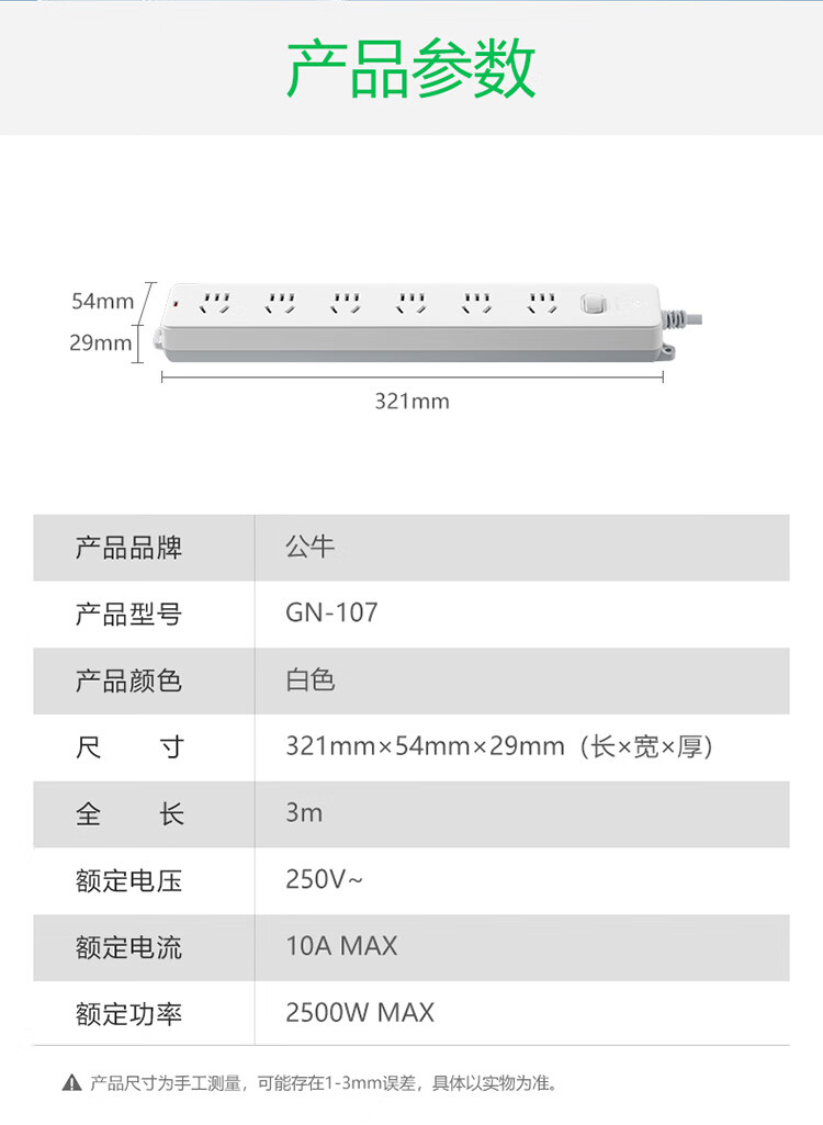 商品名称:公牛 新国标过载保护插座 3米 GN-107