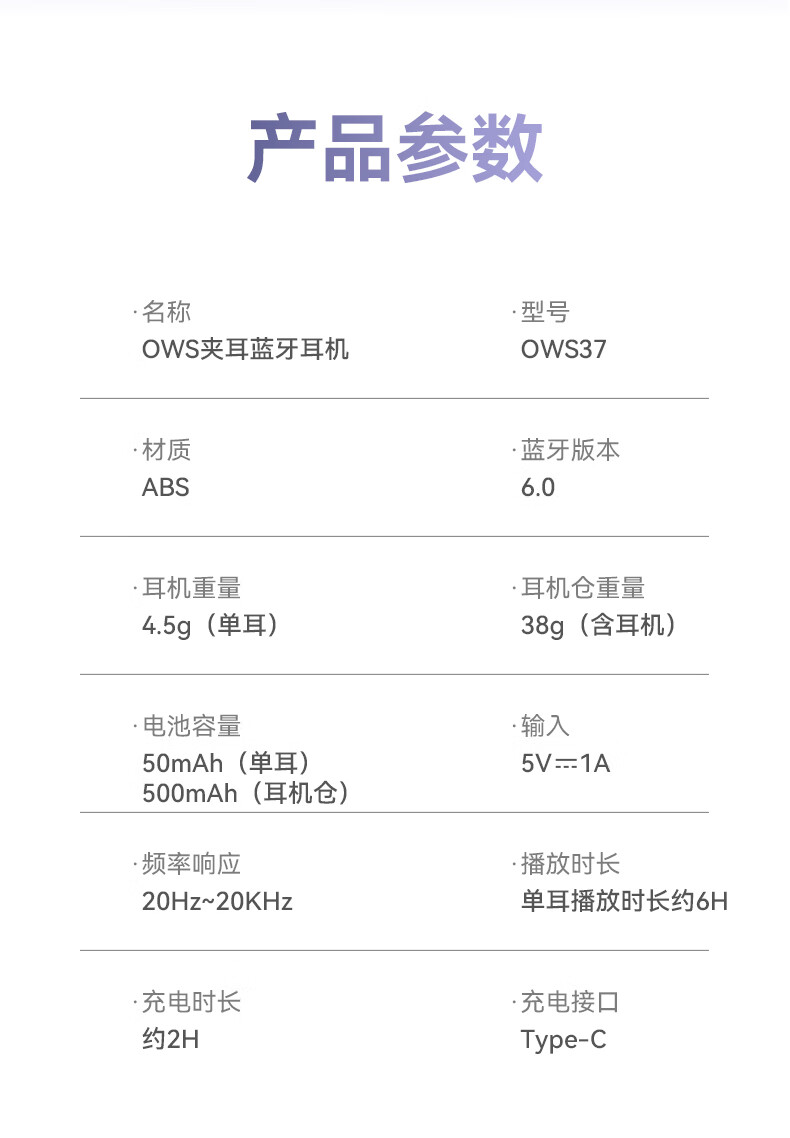 商品名称:沃品 OWS夹耳蓝牙耳机 OWS37
