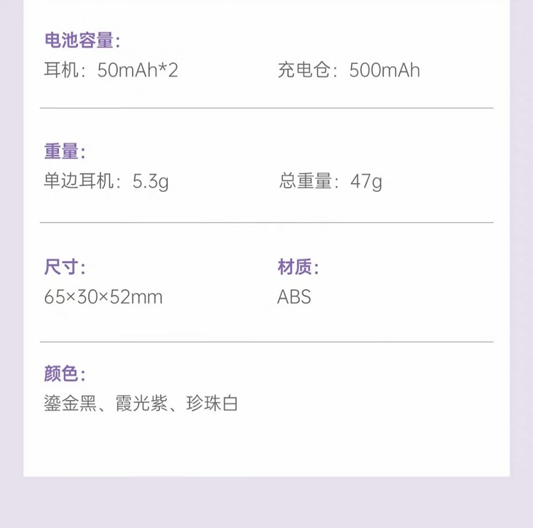 36g(单独充电仓) 5.3g(单边耳机)总重量:47g