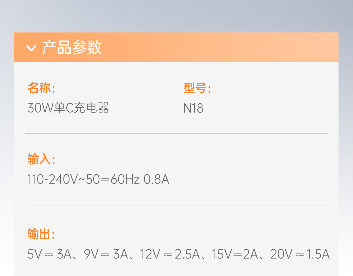 商品名称:沃品 30W单C充电器 N18 (电商款)