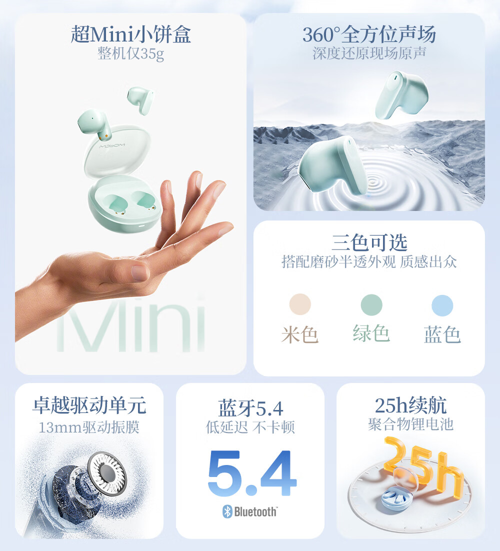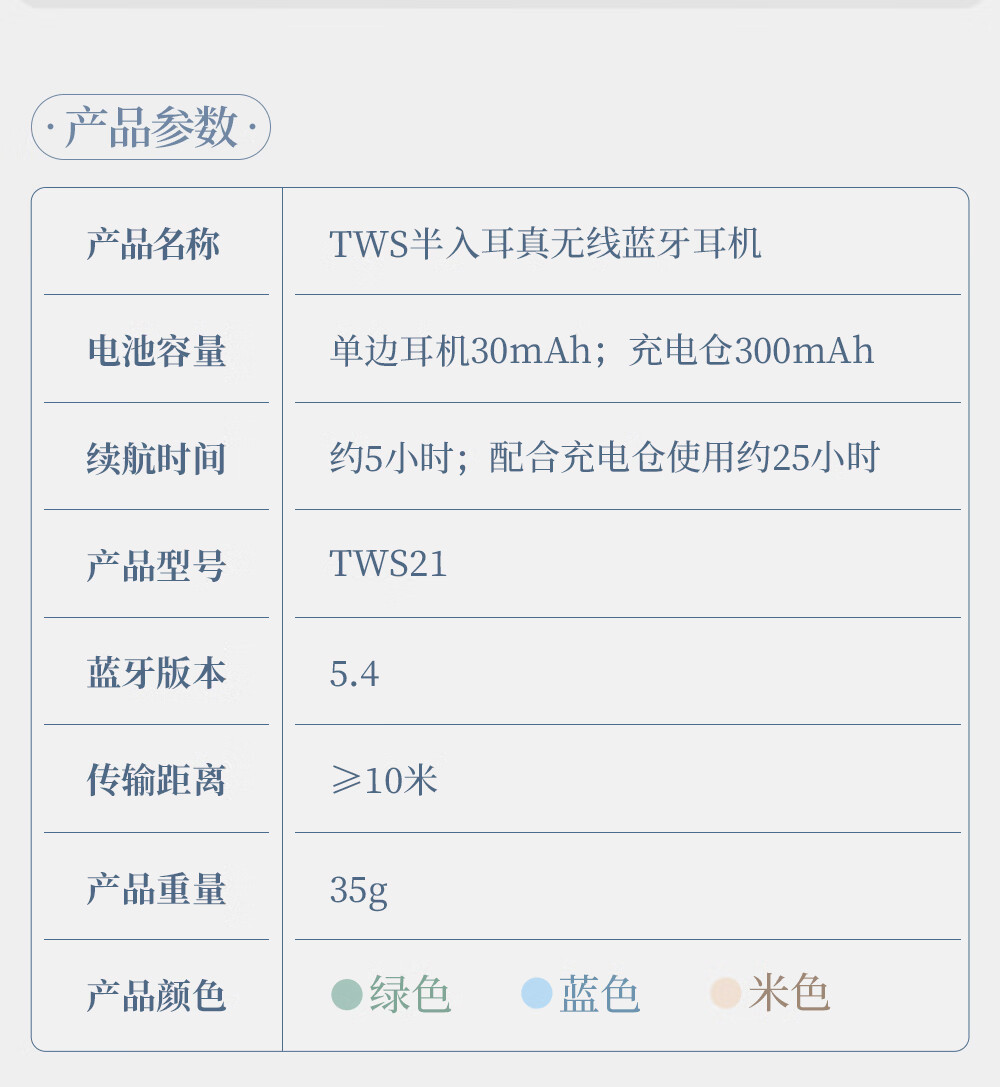 产品净重 :单边耳机3.5g;充电仓28g 总重量:35g