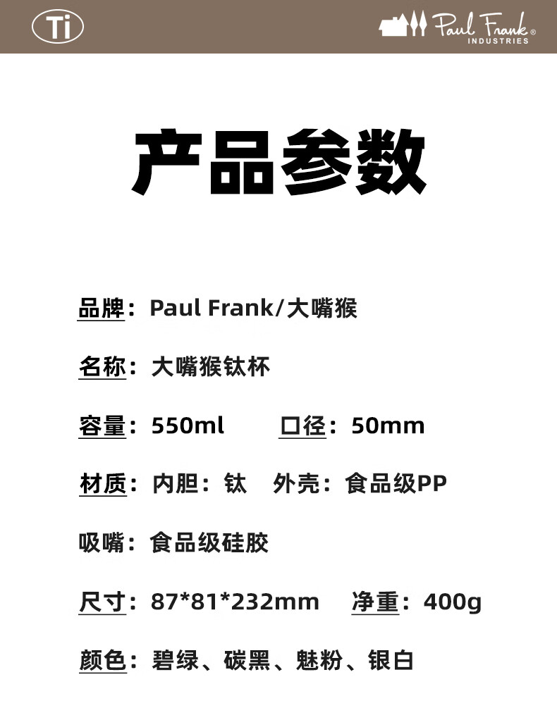 商品名称:大嘴猴 Paul Frank 塑钛杯 550ml PF905-550