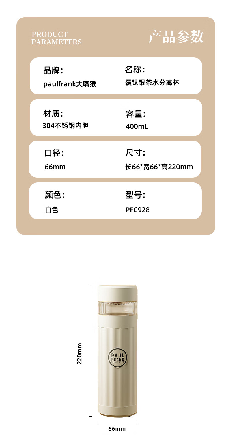 商品名称:大嘴猴 Paul Frank 茶水分离保温杯覆钛银 400ML PFC928