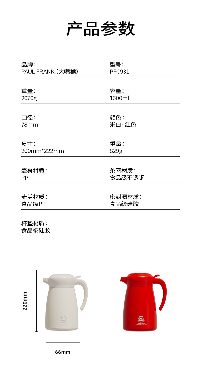 商品名称:大嘴猴 Paul Frank 水壶 1.6L PFC931