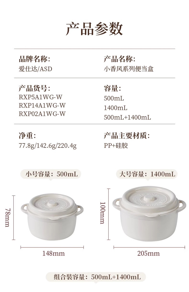 商品名称:爱仕达 小香风系列便当盒 500ml+1400ml RXP02A1WG-W