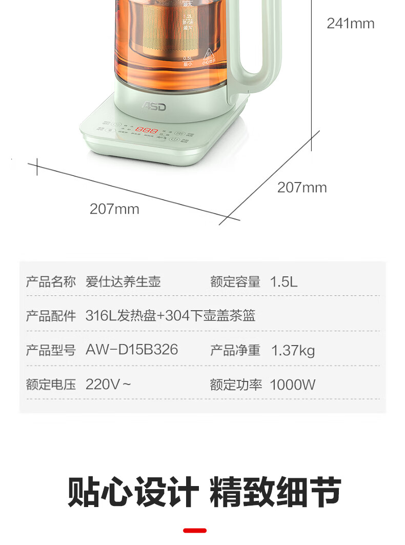 商品名称:爱仕达 轻养系列养生壶 1.5L AW-D15B325