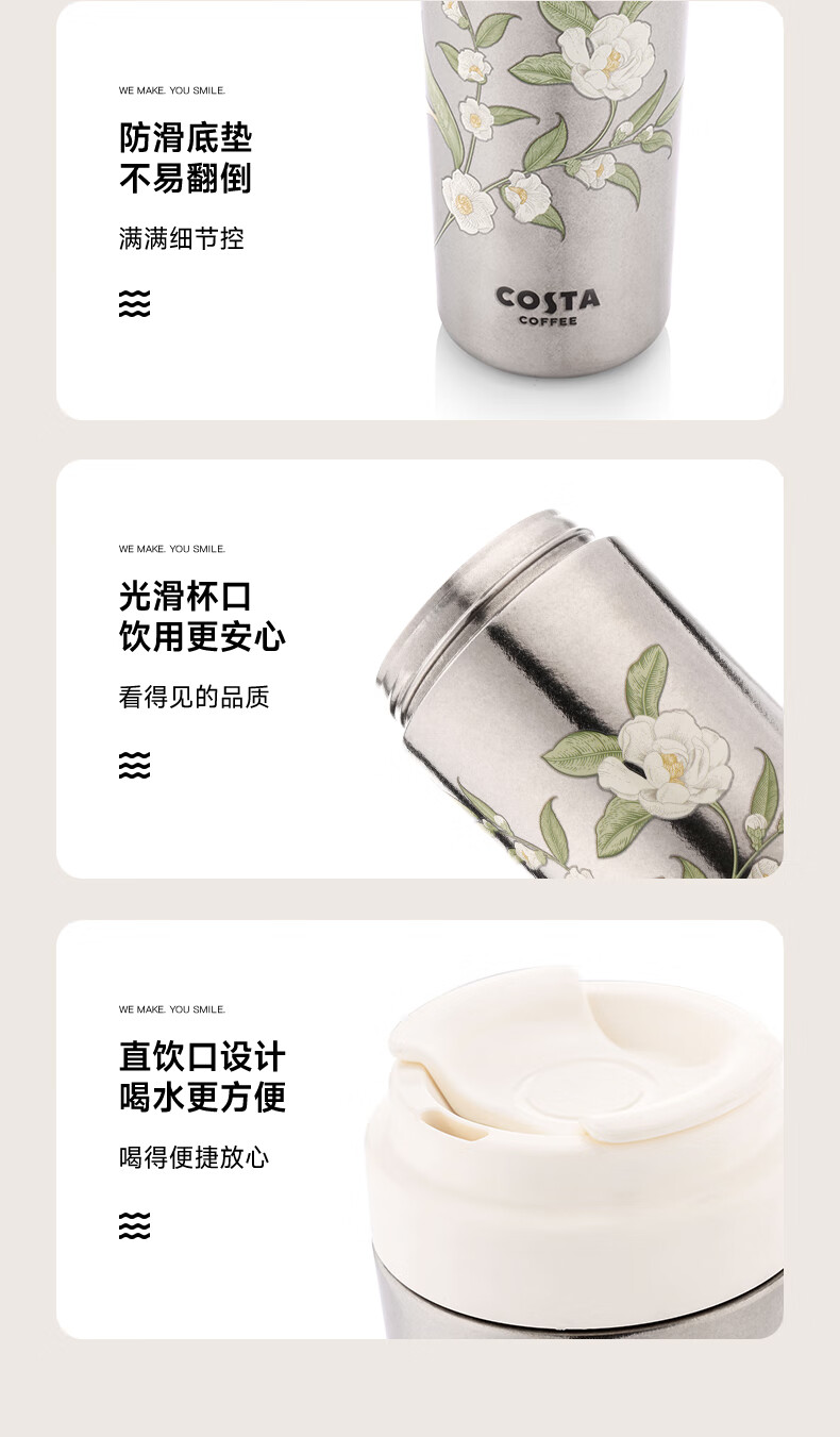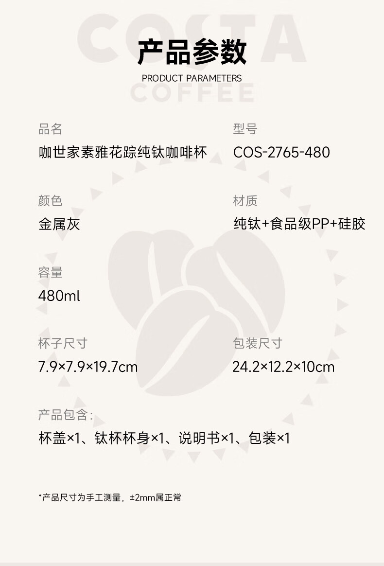 商品名称:咖世家 纯钛咖啡杯 480ML COS-2765-480(素雅花踪)/COS-2772-480(都市银锋)