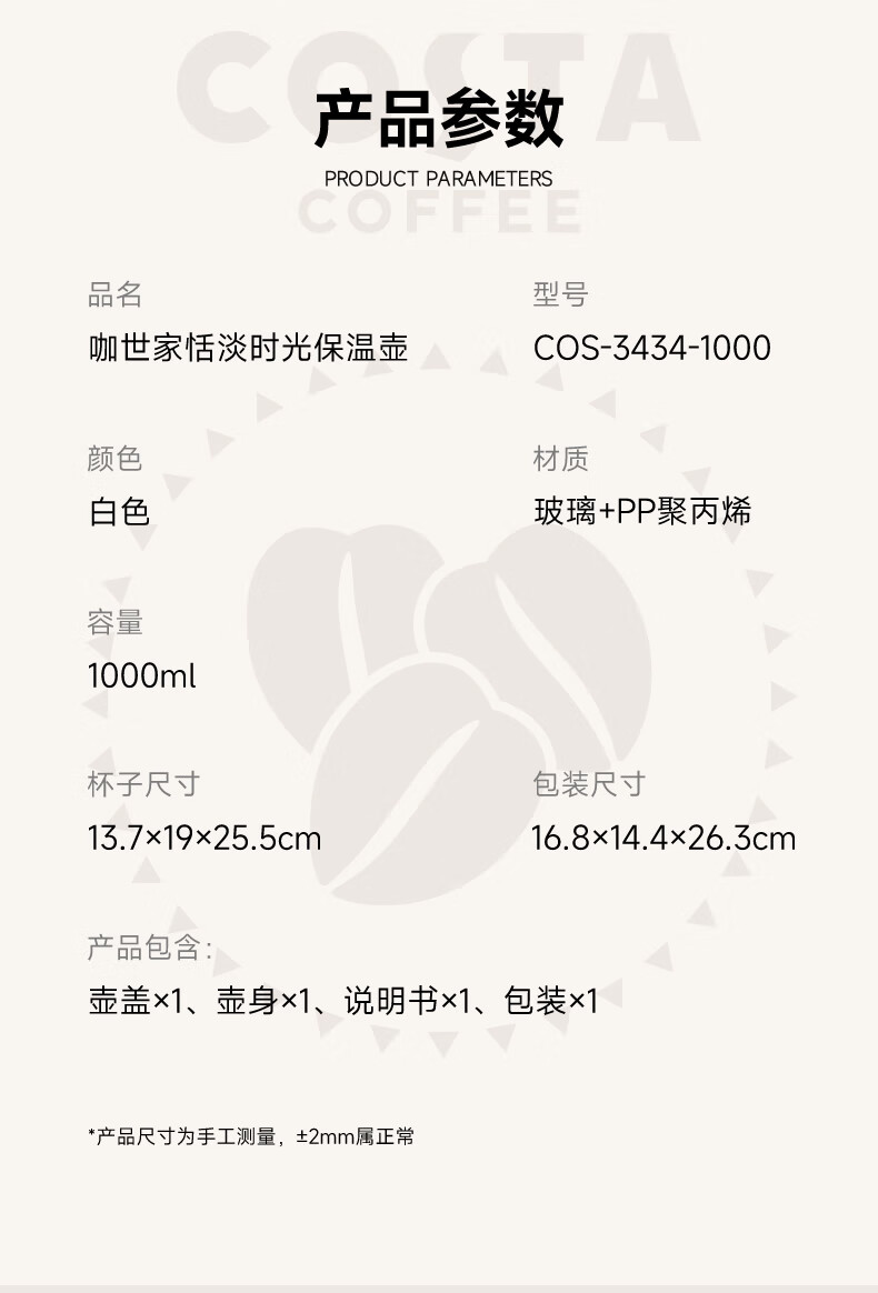 商品名称:咖世家 恬淡时光保温壶 1000ML COS-3434-1000