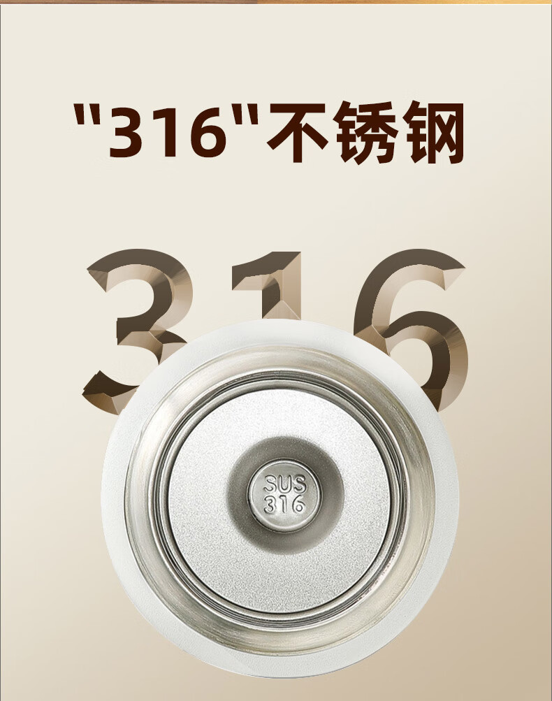 内胆316不锈钢、外胆304不锈钢、塑件聚丙烯(PP)、密封圈硅橡胶(食品用硅胶)