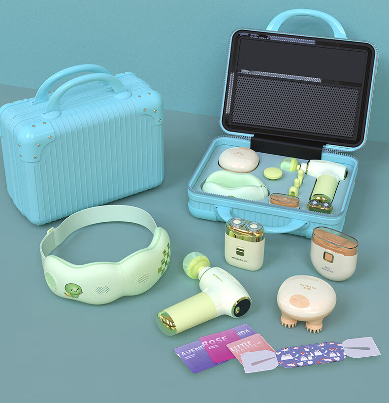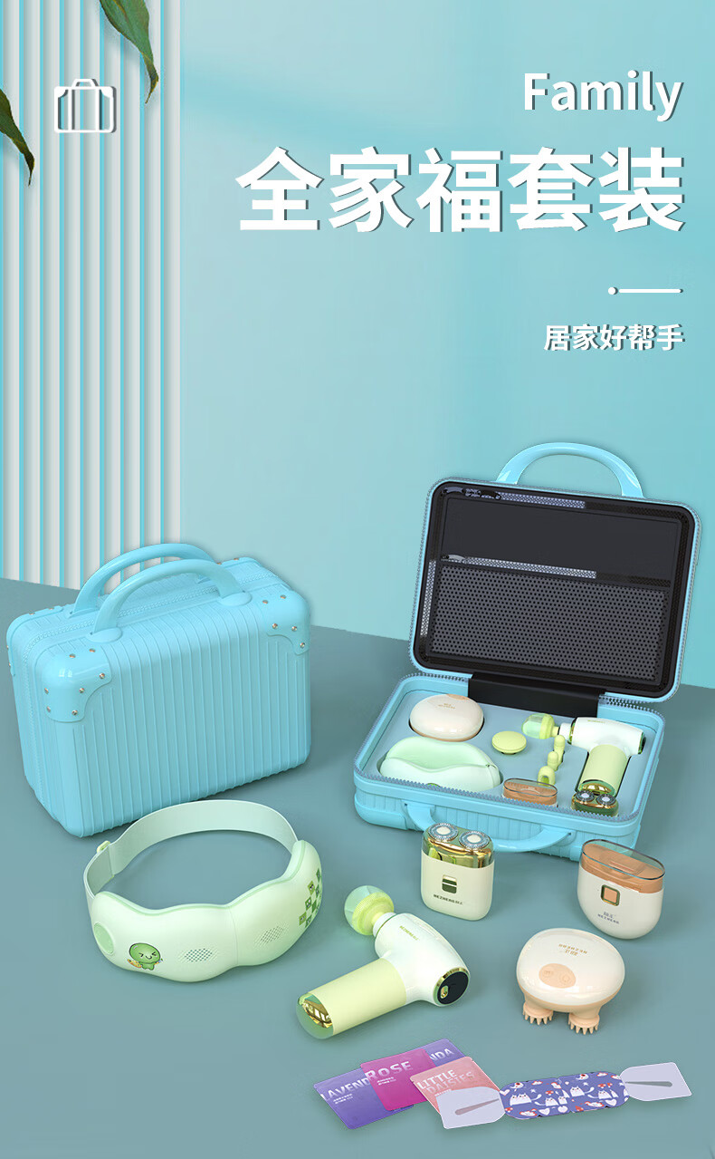1个筋膜枪+ 1个眼部按摩器+1个头部按摩器+1个电动指甲剪+1个电动剃须刀+1盒蒸汽眼罩(6片)