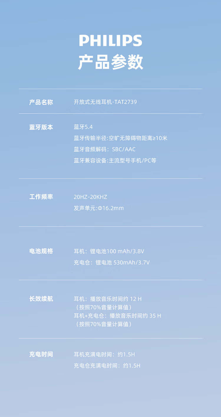 商品名称:飞利浦 蓝牙耳机 TAT2739