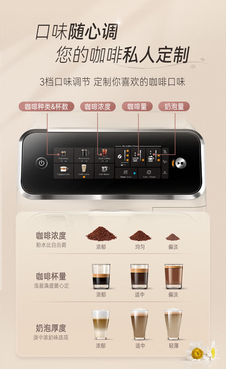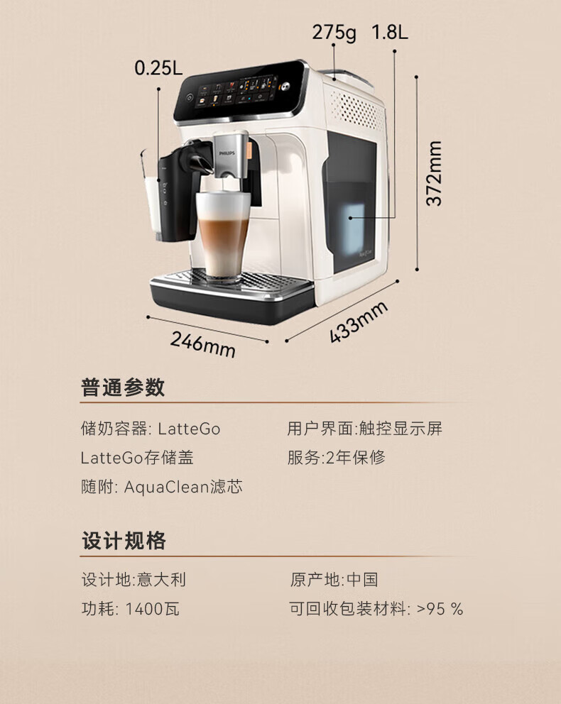 商品名称:飞利浦 全自动咖啡机浓缩冷热萃取研磨一体机 1.8L EP3341/89(白金)/EP3341/82(黑银)EP3341/62(灰金)