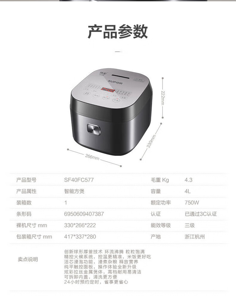 商品名称:苏泊尔 电饭煲 4L SF40FC577
