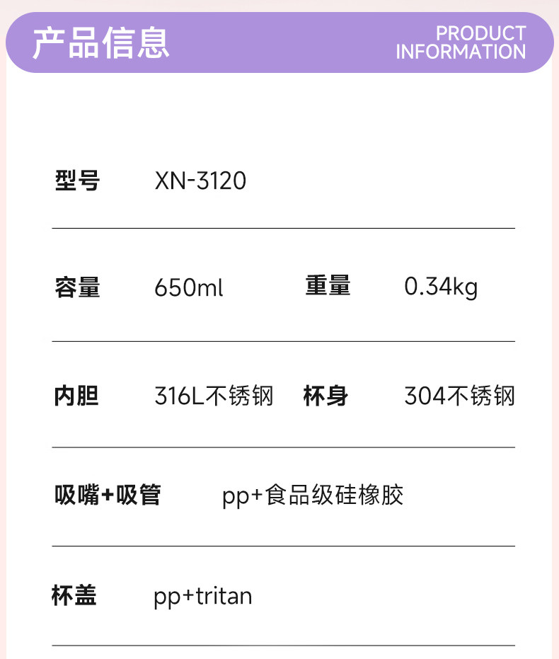 商品名称:希诺 保温杯(热销款) 650ML XN-3120