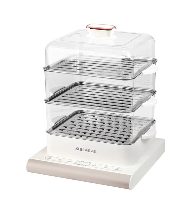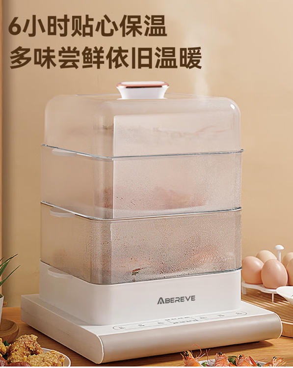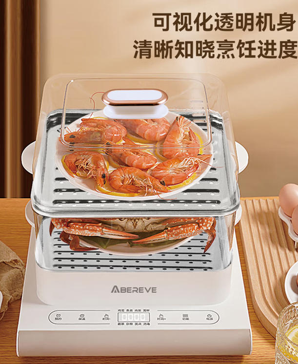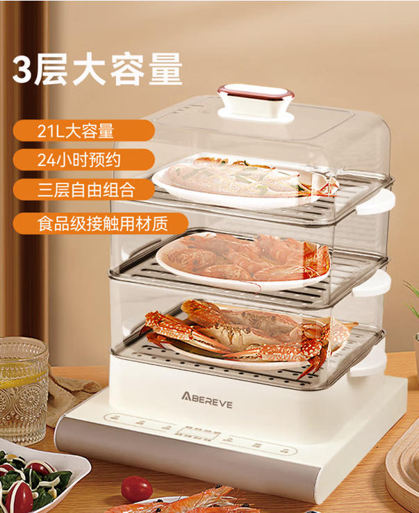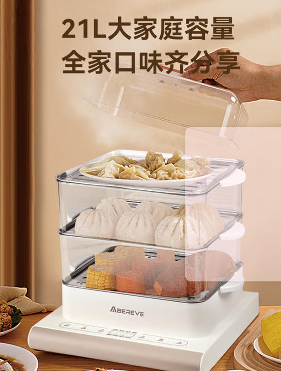 ◁海鲜/肉类/蛋羹/面点/杂粮/餐具消毒/等 一键式12大多样功能 ◁21升大容量,三层大空间,满足全家口味