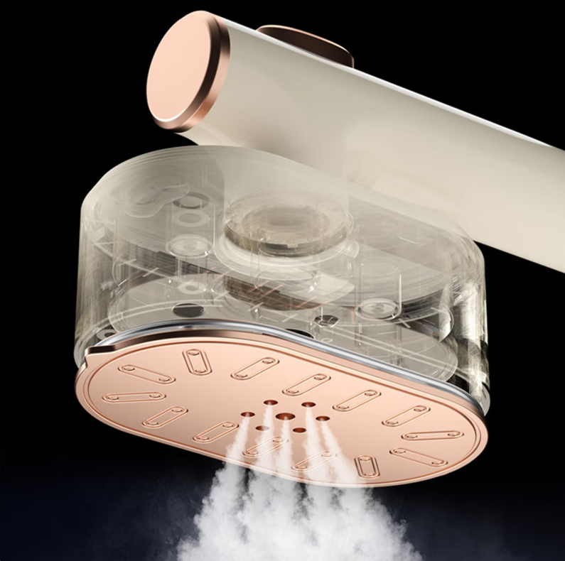 ◁内置1000W大功率搭配智能增压细化技术,蒸汽细腻有力,锁住蒸汽湿度,实现熨烫加速,高效熨烫 ◁平烫/挂烫两用