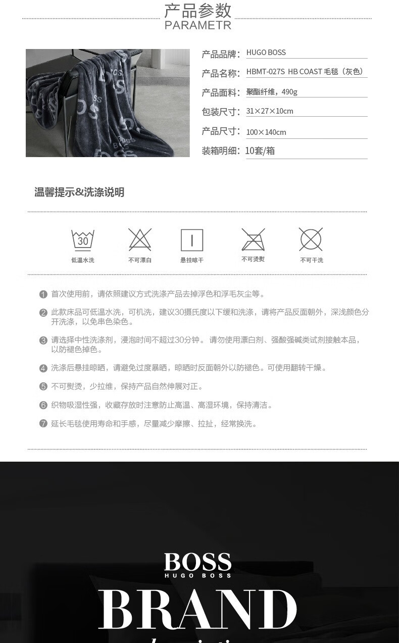 商品名称:BOSS HB COAST 毛毯(灰色) HBMT-027S 100×140cm