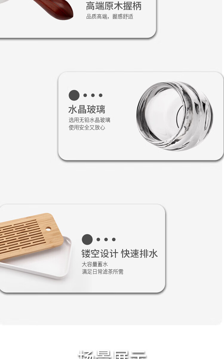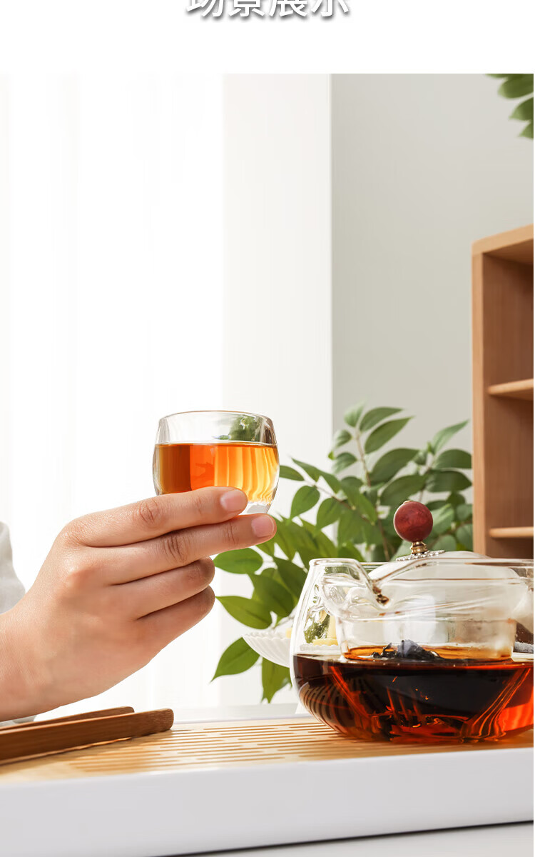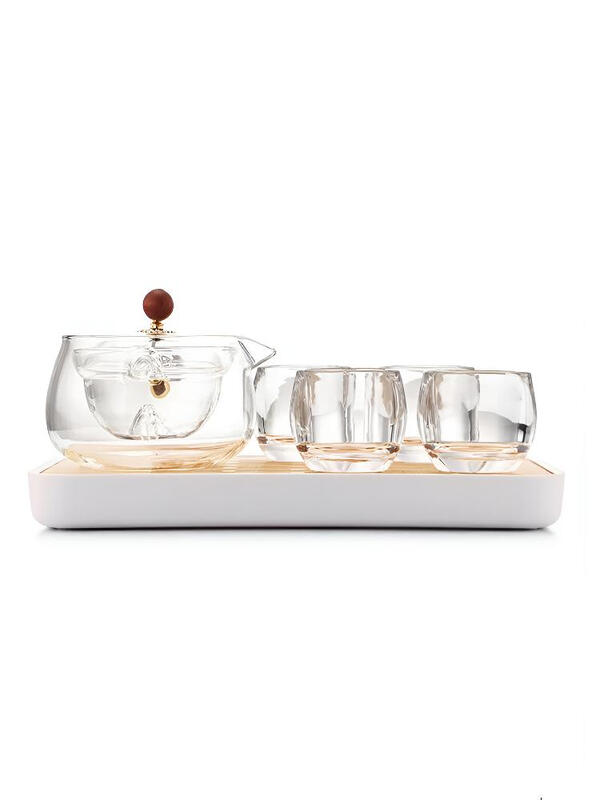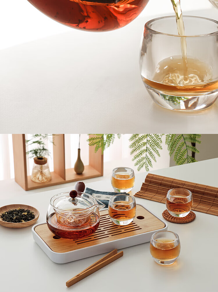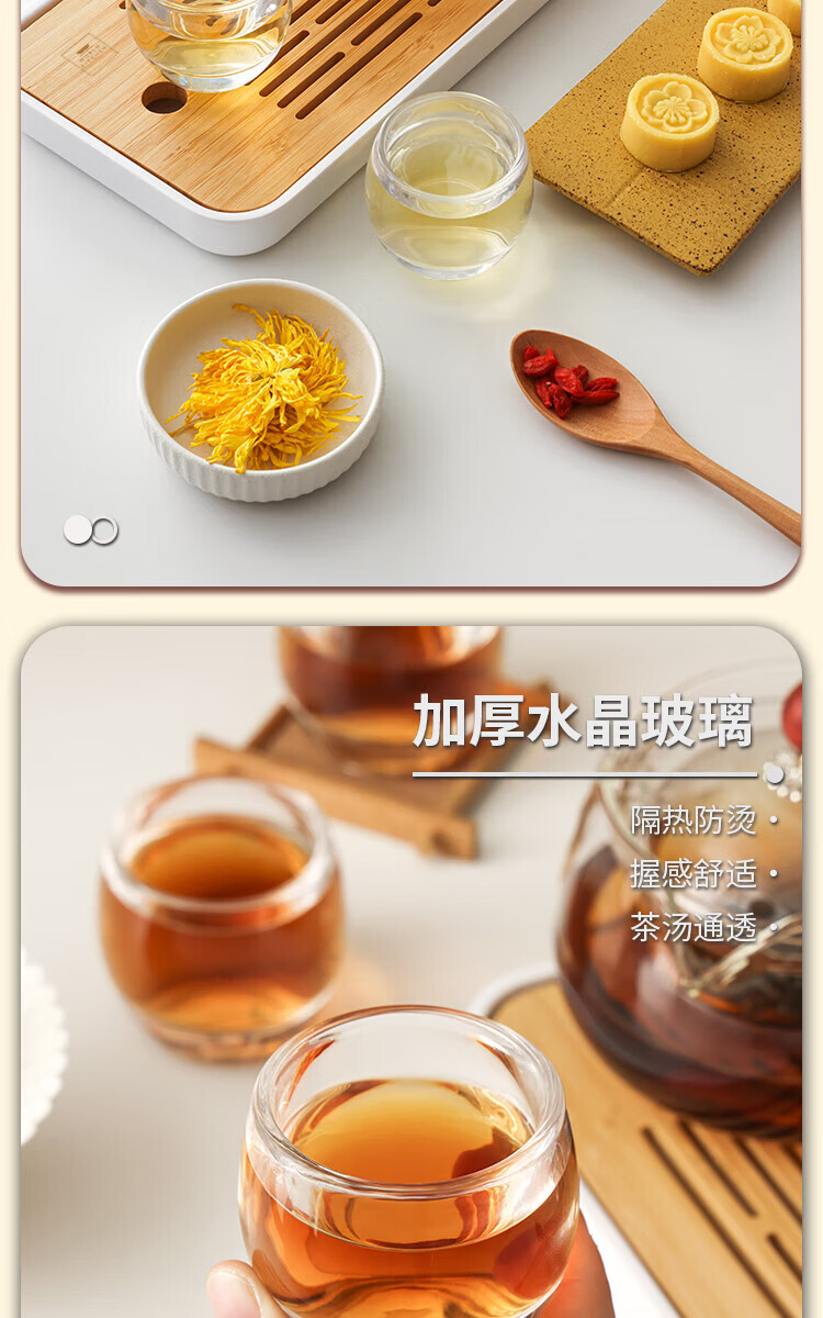逍遥壶:高硼硅玻璃+原木 品茗杯:水晶玻璃 茶 盘:密胺塑料+竹木