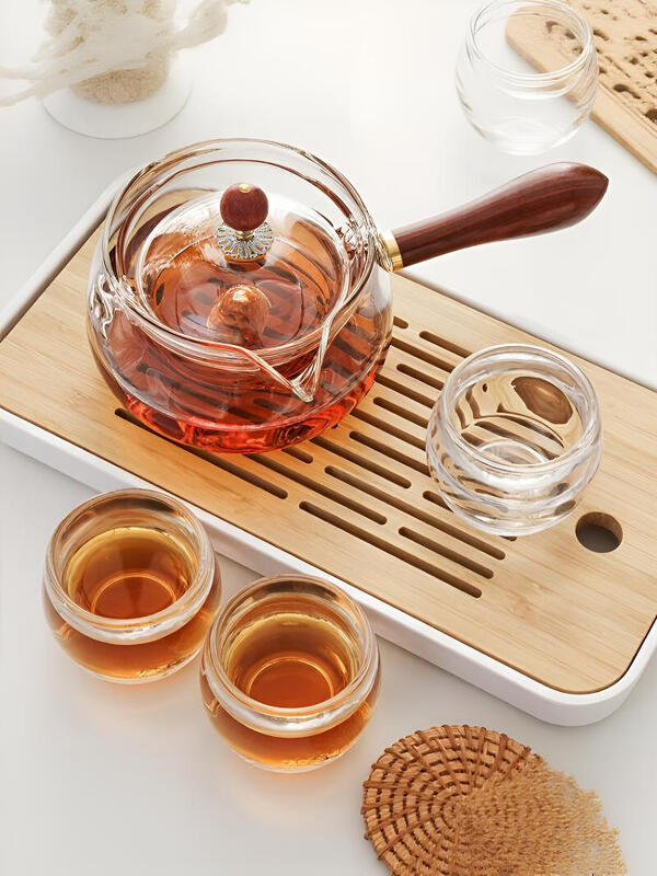 材质 :逍遥壶:高硼硅玻璃+原木 品茗杯:水晶玻璃 茶 盘:密胺塑料+竹木