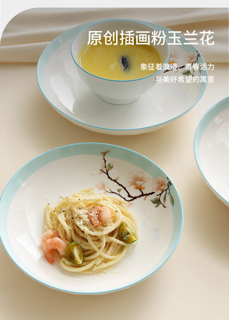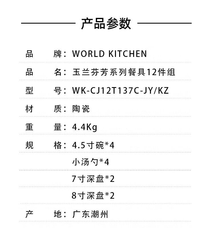 商品名称:康宁 玉兰芬芳系列餐具12件组 (4.5寸碗*4+小汤勺*4+7寸深盘*2+8寸深盘*2)WK-CJ12T137C-JY/KZ