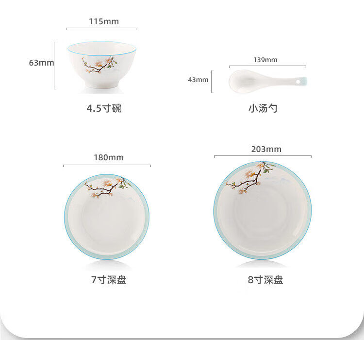 产品尺寸 :4.5寸碗*4+小汤勺*4+7寸深盘*2+8寸深盘*2