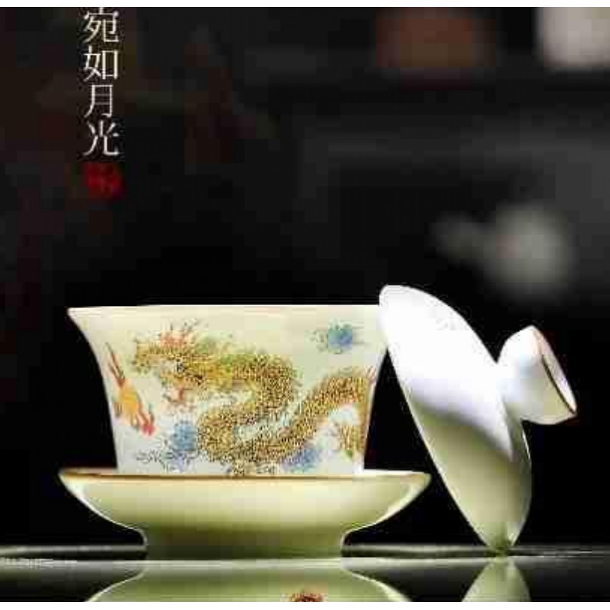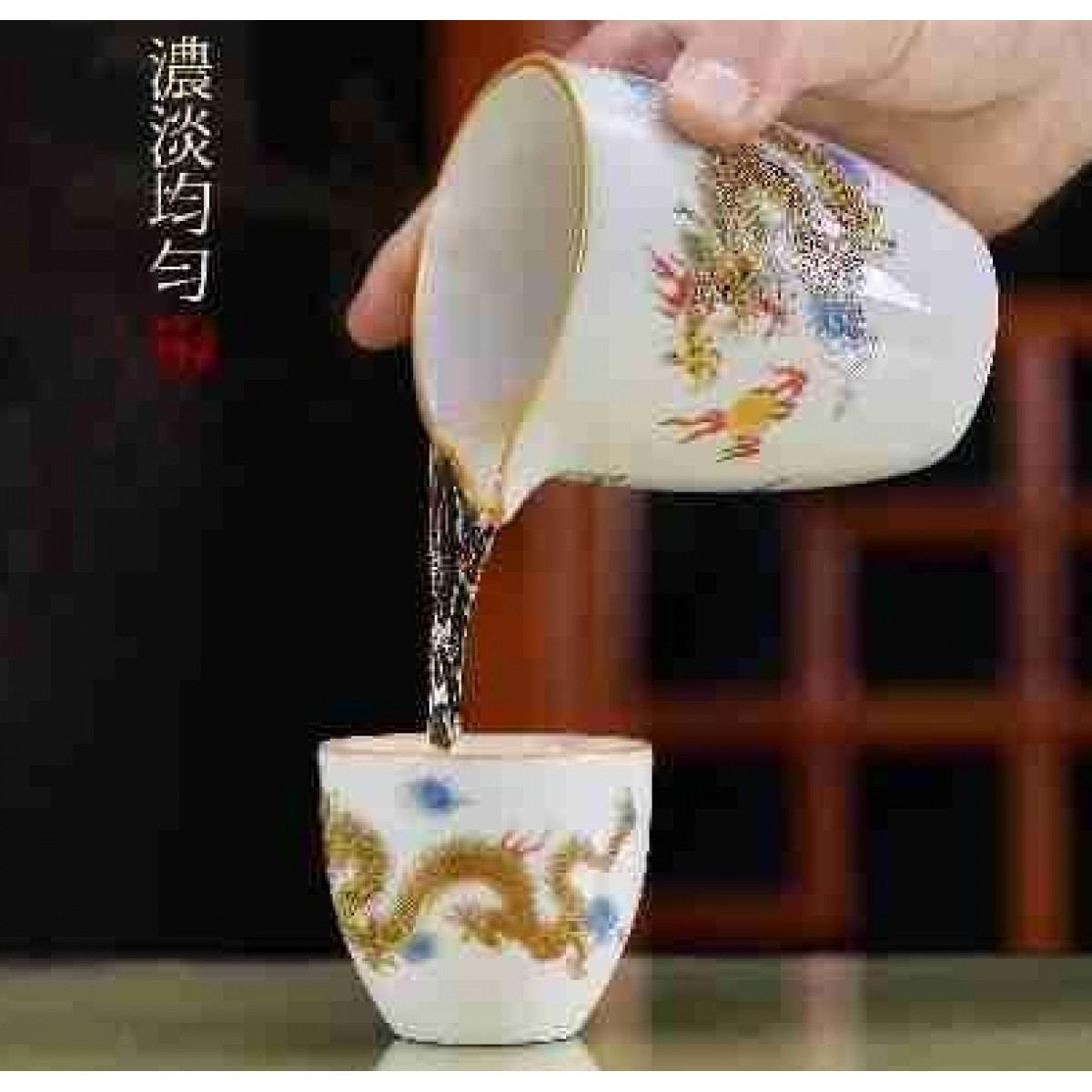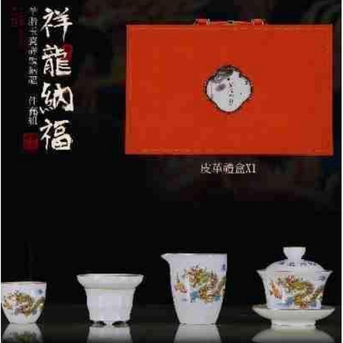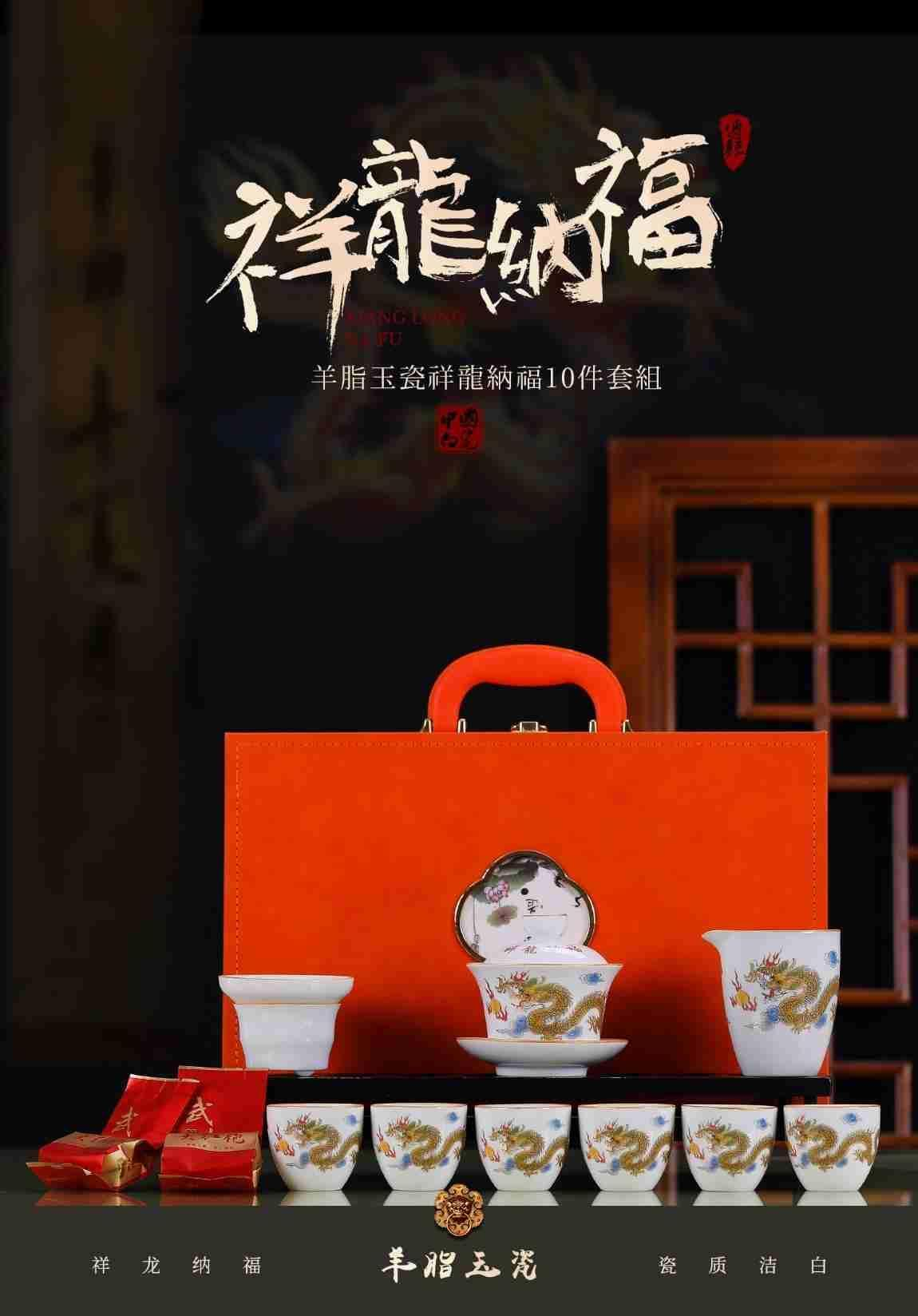 商品名称:羊脂玉瓷祥龙纳福10件套组 盖碗+公道杯+茶漏组+茶杯+茶叶
